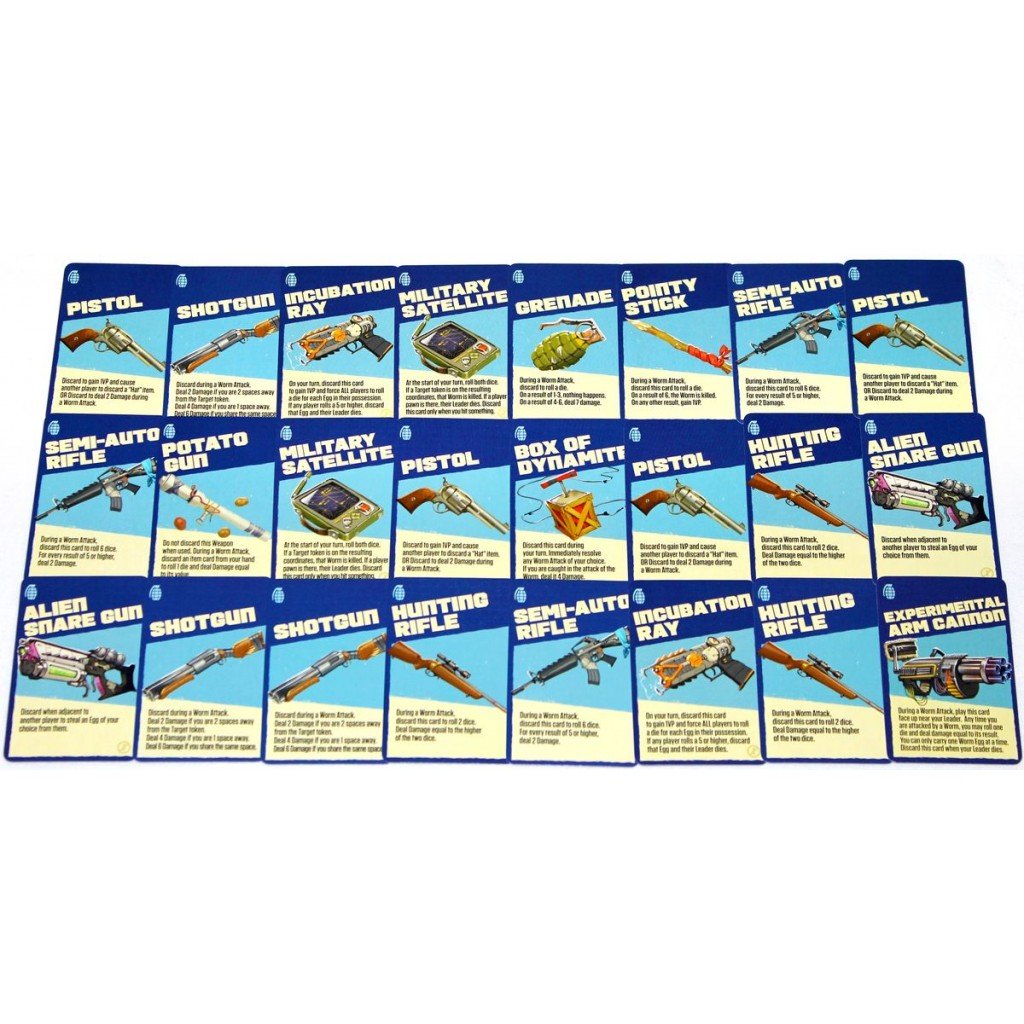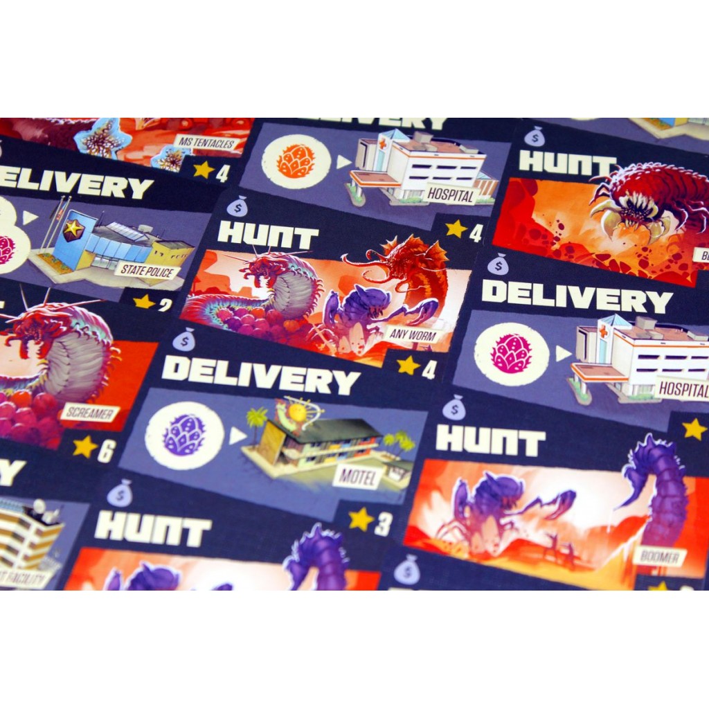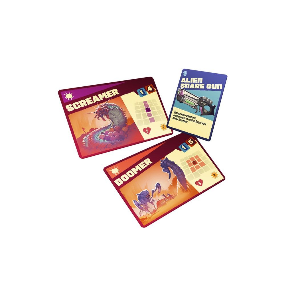 Terror Below est donc un Pick Up & Delivery comme on dit chez nous, un principe simple qui consiste à récupérer des marchandises ou des objets et à les livrer. Un tour de jeu est très simple puisqu’il suffit de jouer une carte qui nous donne le nombre d’action que l’on va pouvoir faire durant notre tour. Le point fort du jeu c’est l’apparition des V.E.R., à partir d’un certain nombre de cartes un V.E.R. sort de terre, et il est drôle de faire sortir des V.E.R. et de mettre vos adversaires dans le pétrin, surtout si vous savez qu’ils ne sont pas équipés pour le combattre, cela peut s’avérer très stratégique. Il va donc falloir la jouer fine, s’équiper comme il faut, et prendre les œufs rapidement afin de prendre des points.