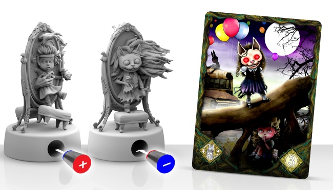 The Faceless se présente dans une belle boite au format atypique, grande et fine, l’illustration de la boite est juste magnifique, très horrifique et enfantine à la fois, les cartes du jeu sont elles aussi magnifiques, c’est du très grand art et ça fait très très envie, et c’est signé Massimo Fratini et Carlo Giannetti. Le matériel est lui aussi de très bonne qualité, et on y trouve 2 plateaux de jeu, 3 figurines Faceless, 1 figurine BILLYGOAT, 1 boussole, des pions de toute sorte, des cartes, 1 dé spécial, 1 sablier, des aimants … Bref plein de matériel, y a de quoi faire.