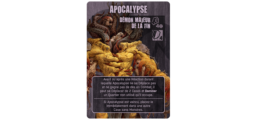 Outre le fait d’introduire des nouvelles tuiles de plateau, histoire de diversifier les mises en place, c’est surtout Apocalypse qui change la donne, puisqu’il peut être utilisé comme un monstre standard. Ce qui veut dire qu’il peut, en réaction se déplacer, prendre par à un combat, comme tout monstres du plateau. Mais il peut aussi, et ça c’est la nouveauté, dominer un quartier, et lorsqu’il choisit cette option, il peut se déplacer de 2 cases, pour rentrer dans un quartier.