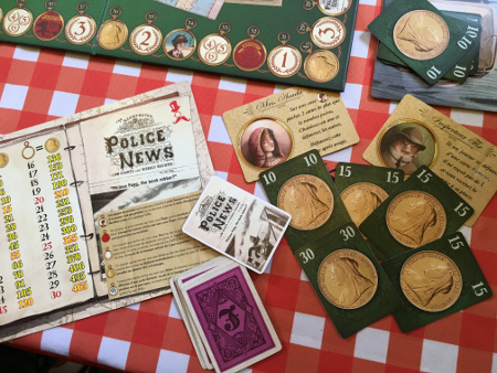 - La case Police : lorsque l’on arrive sur cette case, on doit retourner son pion chapeau, afin de montrer son respect aux forces de l’ordre. Ensuite lorsque revient votre tour, vous pouvez défausser une carte rumeur et également prendre autant de £ que votre position sur le plateau x10.