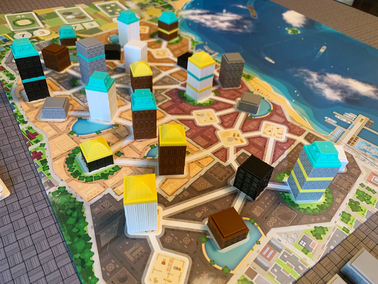 La mise en place est rapide, chaque joueur prend son plateau joueur, ses marqueurs engins, les toits de la couleur du plateau. On place le plateau de jeu au centre de la table avec à proximité le container, directement extrait de la boite de jeu. Ce container contient tous les étages de building rangés par couleur ainsi qu’un support pour les cartes. On révèle 3 cartes, et on place sur le plateau 3 étages qui correspondent aux 3 étages indiqués en bas de chaque carte. Ils sont placés aléatoirement sur le plateau, ils ne doivent juste pas être adjacent. On place aussi sur le plateau 3 cartes objectif avec les jetons points de victoire et on est prêt a commencer !