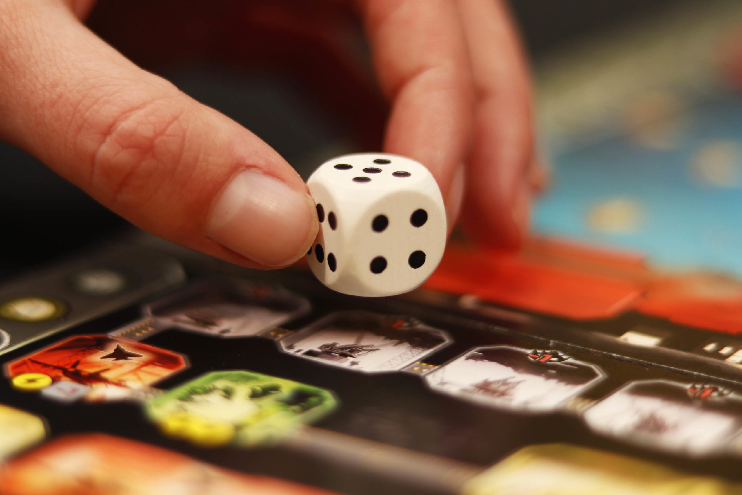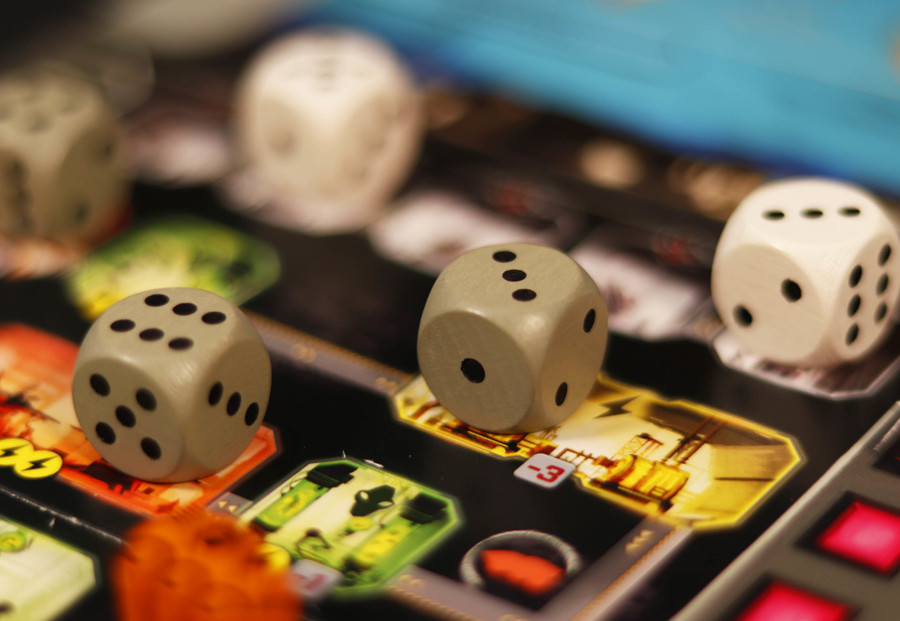 Under Falling Skies se joue uniquement avec des dés, au début de votre tour, vous lancez les 5 dés, et vous allez ensuite assigner 1 dé à une case. Suite à l’assignation du dé, le vaisseau Alien qui se trouve dans la colonne du dé va descendre du ciel d’autant de case que la valeur du dé. Autant vous dire qu’il va falloir bien calculer son coup et éviter de faire descendre les vaisseaux trop vite. Vous allez donc procéder comme ça pour chaque dé, avec quand même 2 contraintes, la première c’est que sur le plateau ou vous posez les dés, il y a 5 colonnes, et il ne peut y avoir que 1 dé par colonne. La deuxième, c’est que lorsque vous assignez un dé blanc (car oui il y a 2 dés blanc sur les 5 dés), vous devez relancer tous les autres dés.