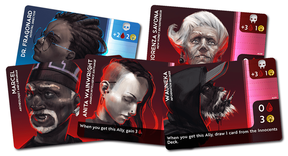 • Se nourrir : donc oui, on parle bien de Vampire et il faut donc se nourrir en buvant le sang de nos alliés et victimes. Chaque joueur va donc récupérer le sang qui est indiqué sur les cartes qu’il possede a droite de sa fiche de clan.