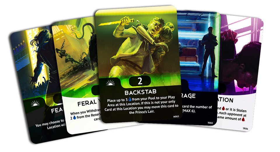 • Planification : durant cette phase, vous allez jouer des cartes sur les différents lieux, on joue une carte à la fois sachant que le nombre de cartes jouées est différent selon la manche, plus vous avancez dans le jeu, plus vous jouez de cartes. Les cartes peuvent être jouées face visible gratuitement, ou face cachée mais pour cela vous devez dépenser 1 sang de votre réserve. Vous pouvez également accompagner vos cartes de sang afin d’augmenter leur puissance, dans la limite de 3 sangs par lieu. Le sang est une ressource limitée, et lorsque vous n’avez plus de sang dans votre réserve, il est possible de drainer une ou plusieurs cartes alliance, du coup vous sucer jusqu’à la dernière goute de sang de cet allié. Vous gagnez donc du sang mais vous perdez votre allié et la capacité qui va avec, et si vous drainer un Vampire, c’est le pire crime que vous pouvez faire, vous prenez donc un jeton diablerie, qui vaudra -1 en fin de partie. Si vous cumulez 3 jetons diablerie, et bien vous êtes éliminé du jeu, donc attention à ne pas être trop gourmand.