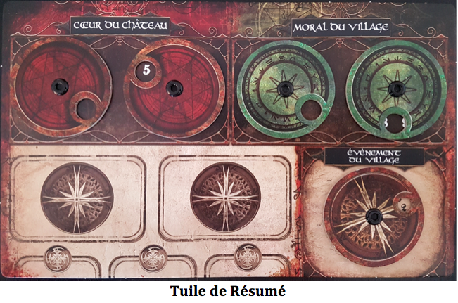 • Phase des villageois : dans un premier temps il faut avancer le cadran des évènements du village qui se situe sur la tuile de résumé, qui indique le moral du village, mais aussi la santé du cœur du château. Le cadran avancera d’autant de crans que de monstres présents, et selon le scenario des cartes évènements seront piocher lorsque le cadran arrivera sur un chiffre bien précis. Ensuite les villageois s’activeront, ils attaqueront dans un premier temps puis se déplaceront. Puis il faudra générer des villageois, un peu comme dans Zombicide, il y a des zones d’invasion, et on piochera une carte villageois pour chaque zone d’invasion.