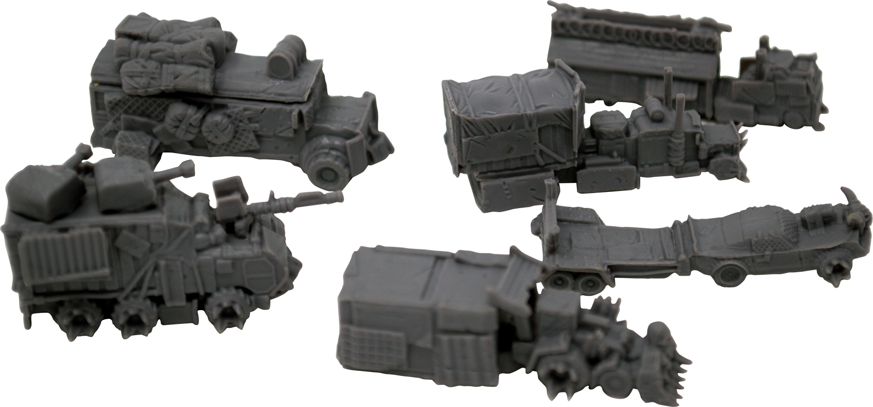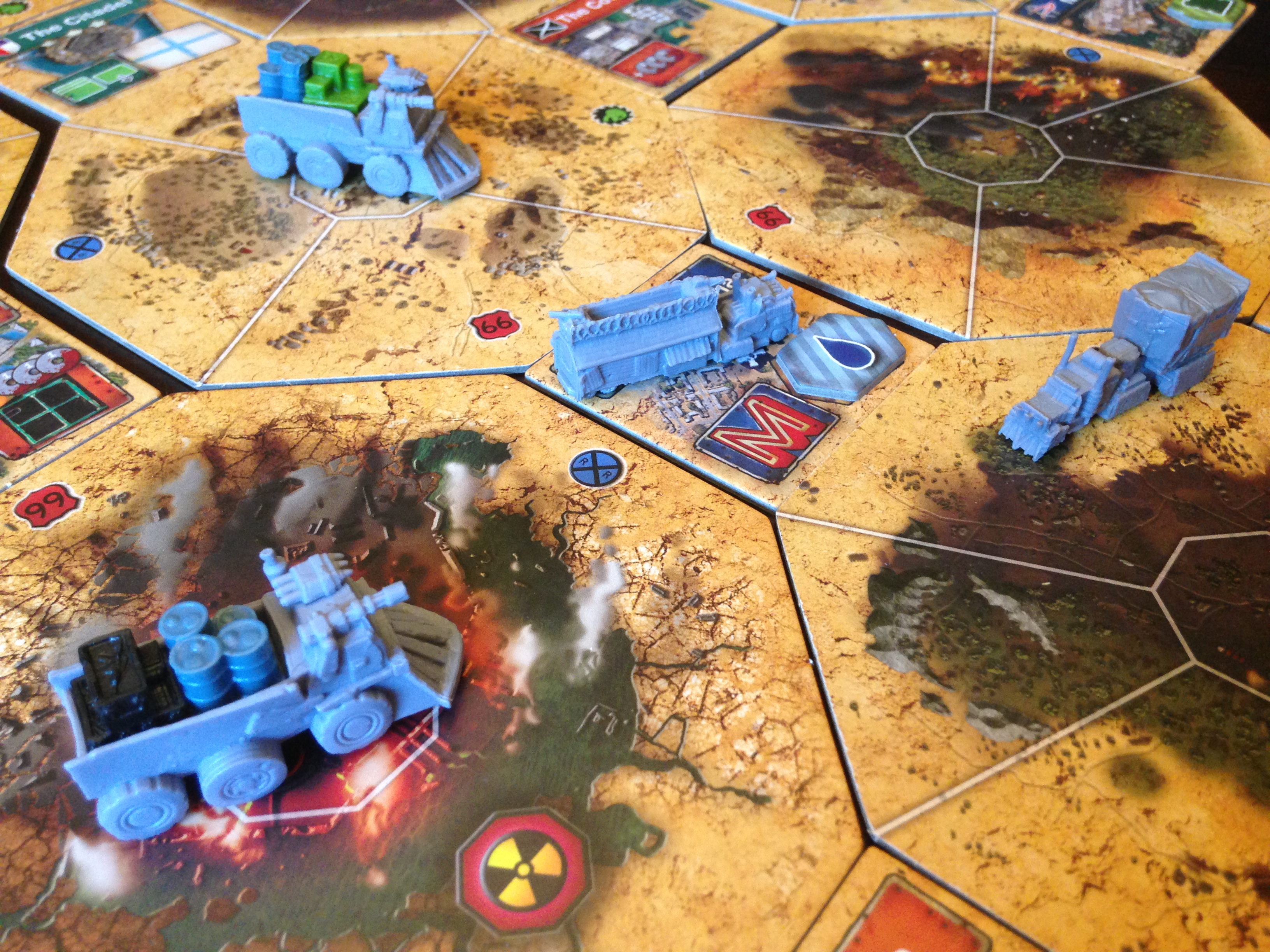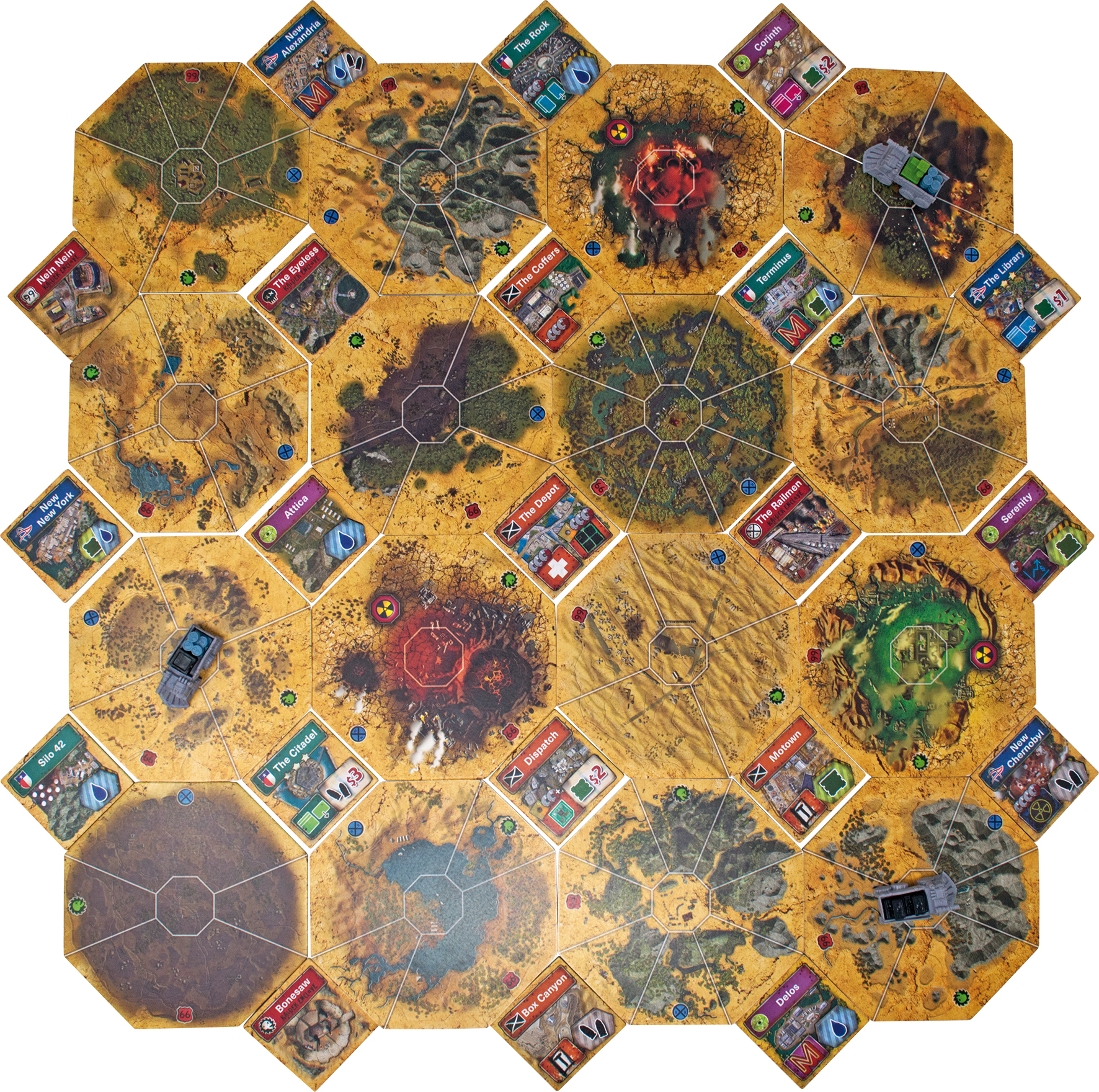 La première fois que vous allez ouvrir une boite de Wasteland, ça va être un peu long, le temps de tout dépuncher, de tout mettre dans les bons rangements… Perso j’y ai passé plus d’une heure. Mais une fois que tout est rangé, la mise en place du jeu est simple et rapide, il suffit juste de composer le plateau de jeu, de placer les différents lieux, et ensuite de mettre toutes les boites de rangements autour de la table. Chaque joueur choisit un personnage avec le camion qui lui est associé, et plateau joueur, 10$ et c’est parti !