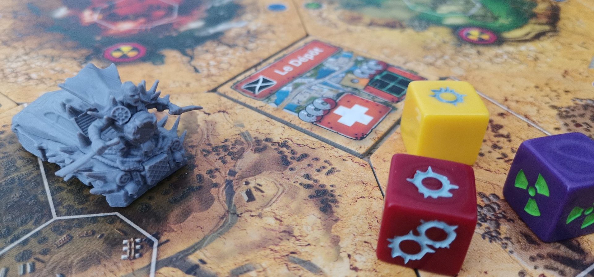 - Déplacer votre Camion : pour déplacer son Camion, il suffit d’assigner un marqueur action au déplacement. dans un premier temps le camion peut se déplacer de 3 cases. Après la plupart de vos actions, vous avez la possibilité de faire une deuxième action immédiate, ce n’est pas obligatoire mais c’est une possibilité, ce qui permet de faire 2 actions lors d’un même tour. Par contre après un déplacement si vous ne faites pas l’action l’immédiate, lors de votre prochain déplacement, votre Camion aura pris de l’élan et pourra parcourir plus de distance, et ça c’est à prendre en compte également. Les déplacements comportent des risques, si vous traversez une zone irradiée, vous devez lancer le dé de radiation, et éventuellement prendre un dégât. Si vous rencontrez un Camion de Pilleur, vous pouvez choisir en action immédiate de l’affronter, sinon vous devez lancer un dé de pilleur et éventuellement prendre un dégât. Et à la fin de votre déplacement, si vous vous trouvez sur une zone avec un symbole de pilleur, et bien vous devez déplacer le Camion qui correspond.