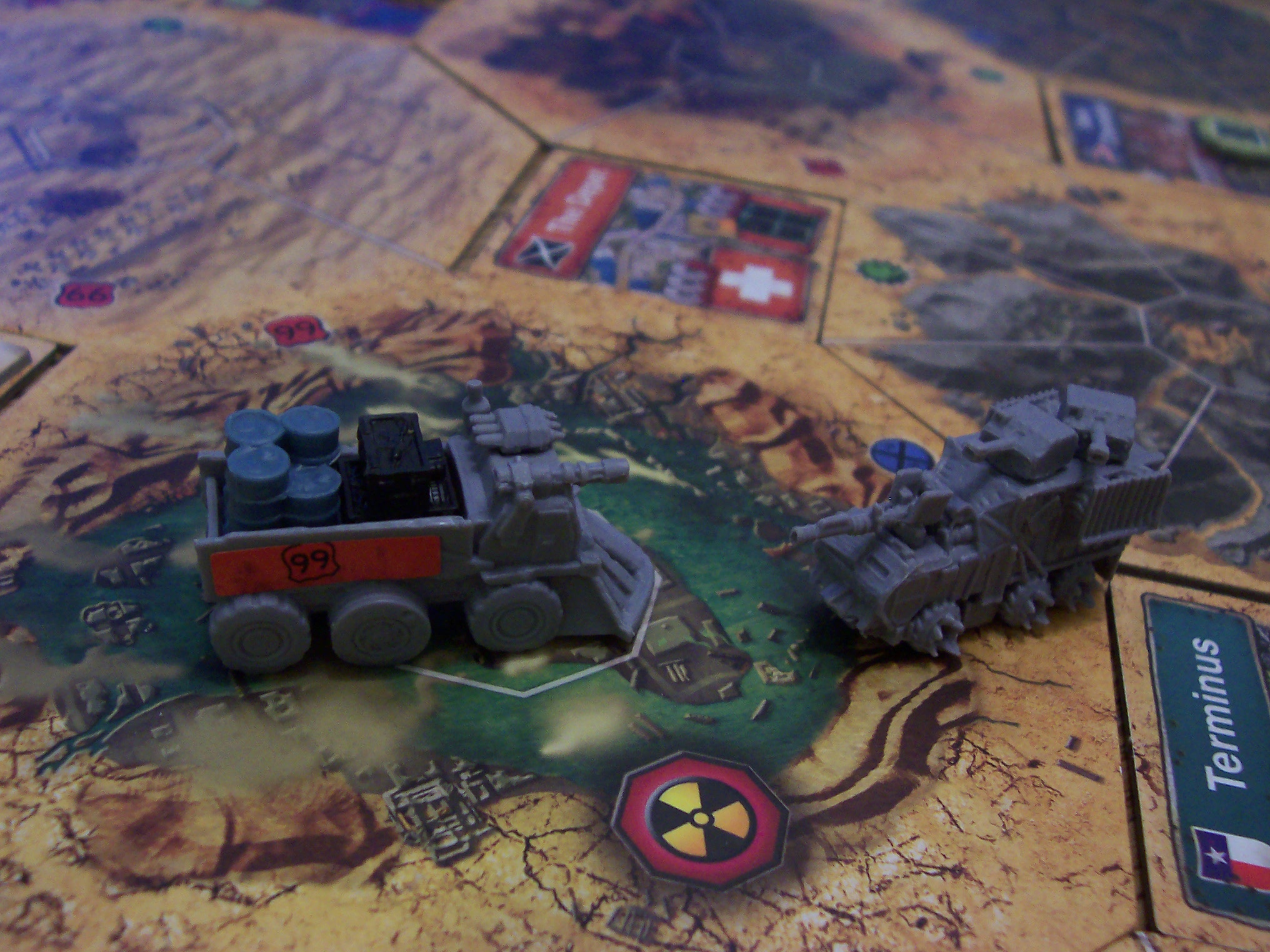 - Attaquer des Pilleurs : vous pouvez soit attaquer un Camion de Pilleur, ou une Enclave de Pilleurs. Lorsque vous attaquez il suffit de piocher une carte, soit de Camion soit d’Enclave, la carte affiche une valeur de défense qu’il faudra égaler ou surpasser pour gagner le combat et donc récupérer soit les ressource du camion, soit les ressources de l’enclave. Si vous perdez le combat votre Camion subit 1 dégât.