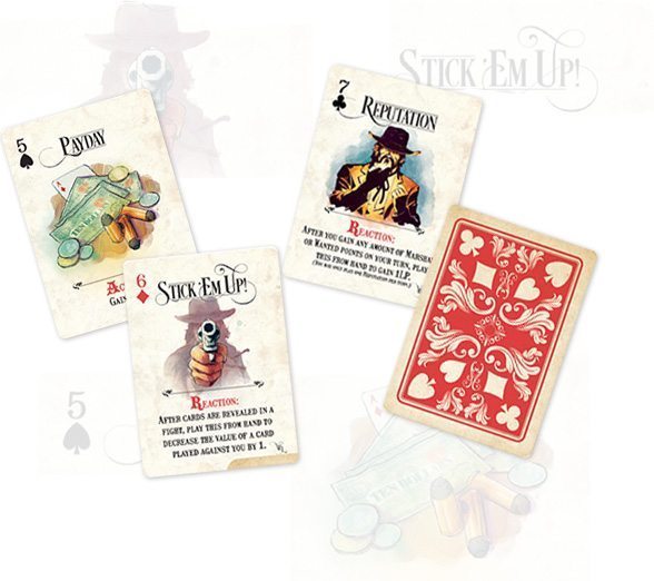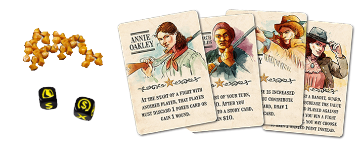 - Phase de début de tour : on vérifie les effets de début de tour s’il y en a, le joueur actif choisit soit de prendre 20 $, soit de piocher 2 cartes poker, soit de piocher 1 carte de poker et de prendre 10$. Ensuite le joueur actif peut choisir une arme et une monture pour le tour.