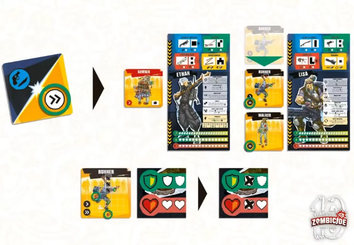 • Avancée des zombies : chaque zombie qui a une icône déplacement qui correspond à celle de la carte tour va avancer, descendre d’un cran vers la bas, et si un zombie ne peut pas se déplacer, il attaque et inflige autant de blessure au survivant que d’étoile rouge encore visible sur sa carte.