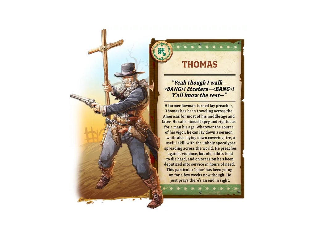 Première nouveauté dans ce Zombicide c’est les classes de perso, il y a les bagarreurs, les religieux, les pistoleros et les citadins. Chaque classe a une capacité spéciale et elles sont plutôt intéressante, comme les religieux qui, pour une action peuvent placer un pion Vade Retro dans une zone en ligne de vue, ce qui annulera la prochaine activation de ce groupe de Zombie.