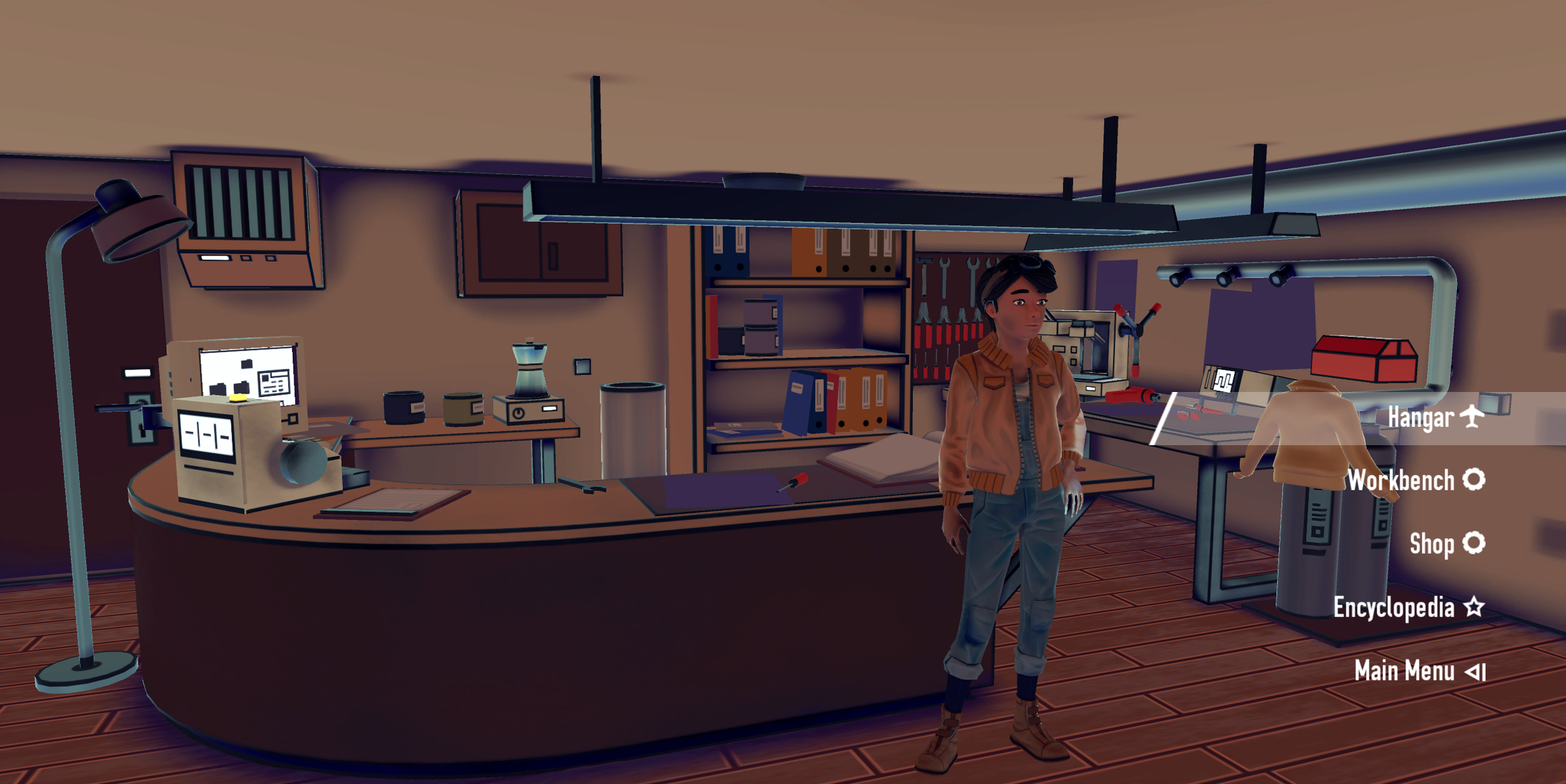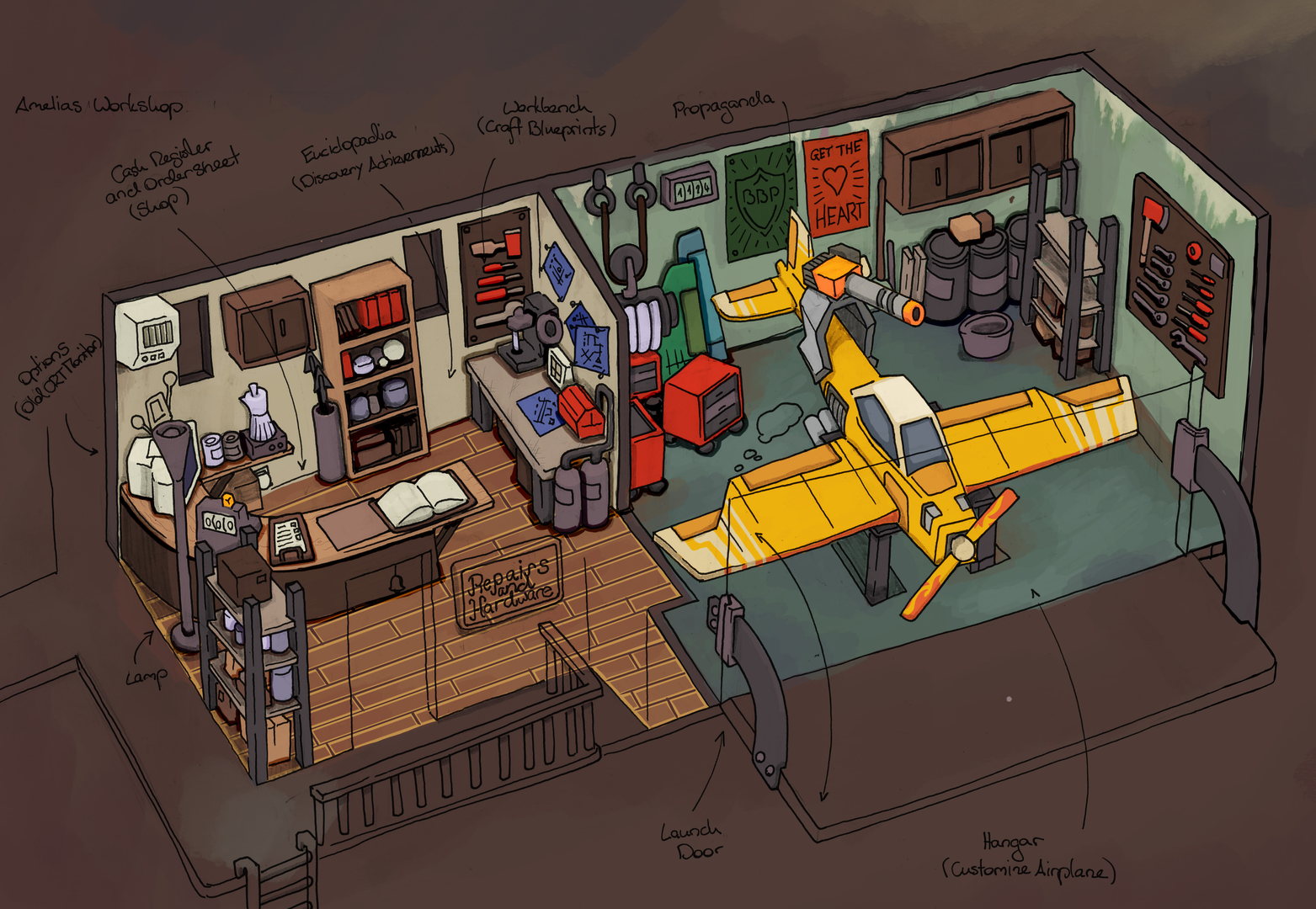 Amelia possède un atelier dans lequel elle peut réparer ou améliorer les différentes parties de son aéronef comme le moteur, les ailes ou les armes. Toutes les pièces peuvent s’acheter ou se construire à l’aide de schémas glanés durant les sorties. Le monde d’AIRHEART pourrait se représenter comme un cône inversé où le point de départ se situe en son sommet, tout en bas. Une fois le portail d’un niveau découvert, on monte d’une couche, la carte s’agrandit et les vaisseaux adverses deviennent plus nombreux et costauds. C’est donc en parcourant ce monde que vous irez à la pêche aux poissons volants (la monnaie du jeu) et aux schémas. Mais l’IA n’est pas du même avis.