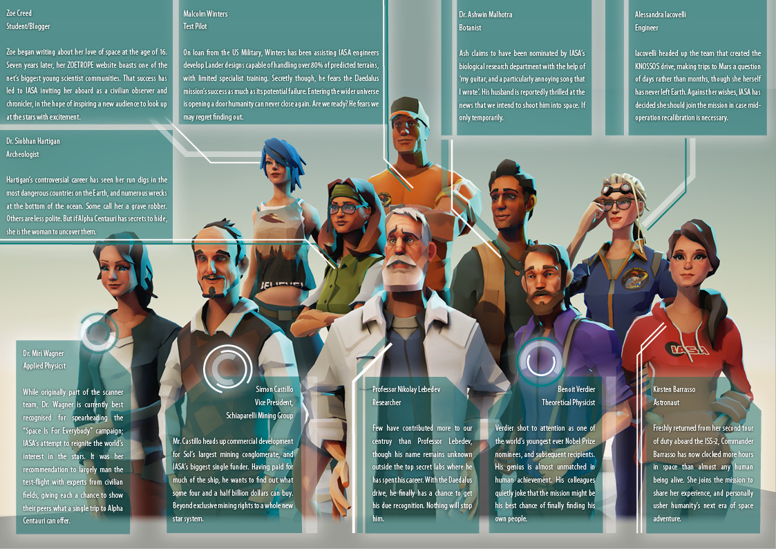 Pour réparer votre vaisseau, The Long Journey Home propose la sélection de quatre membres parmi dix aux traits bien particuliers. Cela va du simple scientifique au botaniste en passant par le blogueur ou le vice-président d’un groupe minier. Il faut donc réussir à combiner quatre caractères différents et complémentaires afin de mener à bien la mission : rentrer sur Terre avec au moins un survivant. Le jeu est présenté comme un RPG où la survie est régi par un lot de statistiques complètes évoluant au cours de l’aventure. Pour piloter le vaisseau, le choix peut s’avérer restreint car tout le monde n’en est pas capable mais les autres postes à affecter le seront aussi. On retrouve alors le genre de jeu de survie où il faut tout calculer à l’avance et tenter de ne faire que des bons choix alors que c’est impossible, comme Dead in Bermuda. Ici aussi la mort sera définitive et signifiera le début d’une toute nouvelle aventure. Petit point intéressant, Daedalic a ajouté la possibilité d’exporter l’entièreté de sa galaxie grâce à un code (comme PolyRace), il vous sera alors possible de recommencer la même aventure ou de la proposer à vos amis pour comparer vos trajets ou les planètes et aliens rencontrés (chose impossible dans les jeux générés aléatoirement d’habitude).