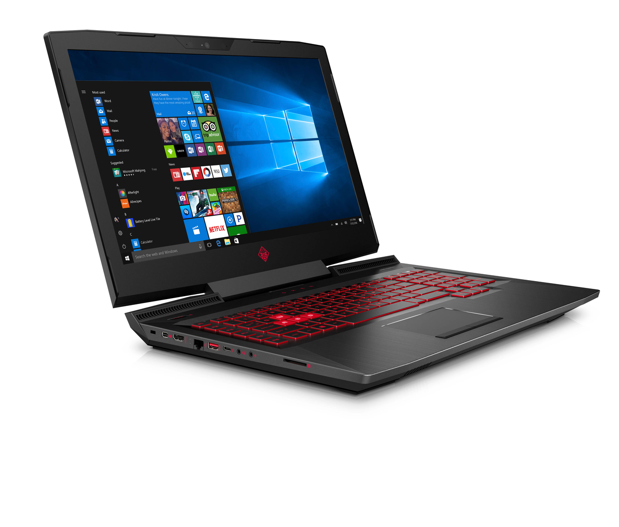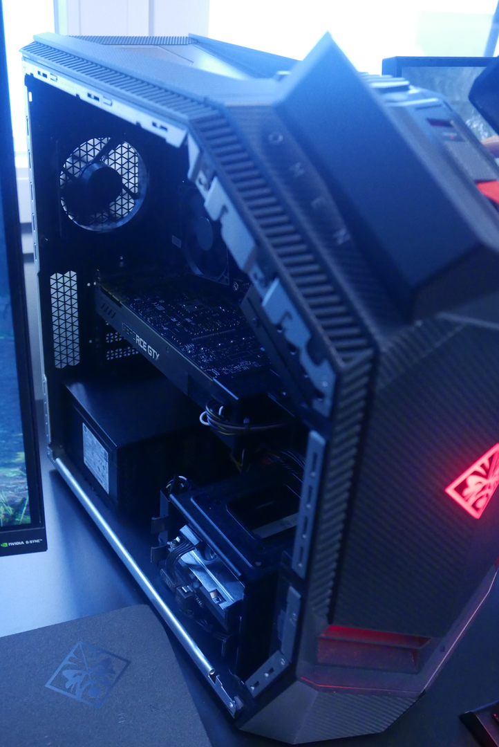 Le tout peut être boosté via son système d’overclocking configurable via les outils OMEN ou en changeant le matériel interne aisément atteignable via une trappe par laquelle on peut accéder à la mémoire vive ou au stockage. Vous retrouverez aussi une tonne de connectiques comme de l’USB Type C via le Thunderbolt, une prise HDMI 2.0 (HDR géré donc), un Mini DisplayPort ou deux prises jack (une pour l’audio et une pour le micro, et ça c’est cool pour jouer ou streamer !)