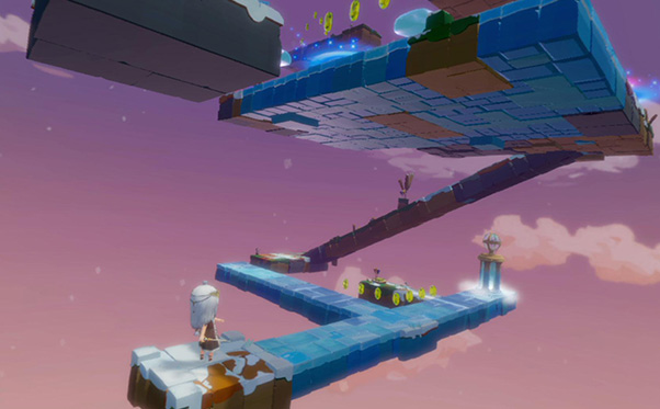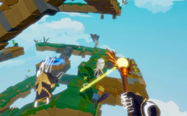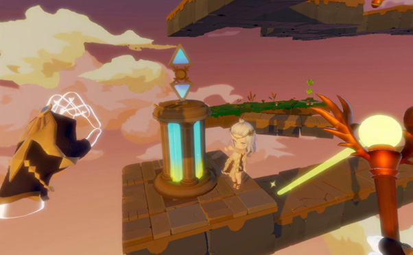 Light Tracer est un titre exclusif au PlayStation VR et c’est donc équipé-e du casque de réalité virtuelle que vous allez vivre les aventures d’une princesse pour monter une sorte de tour de Babel. Avec les PS Move dans vos mains vous pouvez simplement déplacer la caméra ou des objets, ou guider votre héroïne. Votre main gauche représentée par une main, sert donc à pivoter la caméra autour de la tour, de zoomer ou d’agripper certaines plateformes pour effectuer une translation comme un ascenseur, afin de faire monter le personnage. Votre main gauche prend la forme d’un sceptre à la Sailor Moon à partir duquel un rayon jaune pointe un endroit précis. Ce pointage sert à guider la princesse car elle ira en ligne droite de sa position actuelle jusqu’au bout pointé. À vous donc de bien juger l’angle de direction ou les sauts pour ne pas qu’elle tombe.