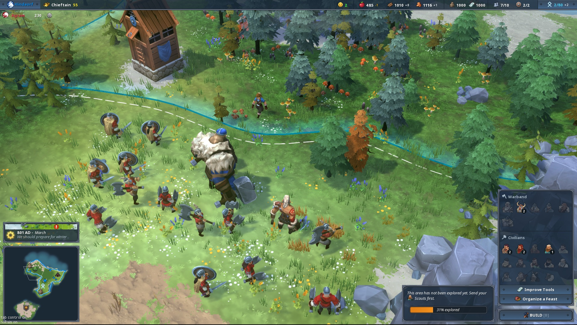 Justement en parlant de clan, vous savez peut-être que Northgard en possède plusieurs, chacun ayant ses propres avantages et inconvénients. Depuis un peu plus de deux mois, le Clan de l’Ours a fait son apparition et offre, par exemple, un bonus durant l’hiver (il y a un cycle des saisons) avec une perte moins importante de la nourriture et des soldats plus résistants durant cette période, contrairement aux autres, et ça c’est du vrai Viking qui pue la classe ! Même si on m’a présenté un clan qui était déjà sorti, c’est une introduction parfaite de la part du développeur pour nous montrer la campagne solo.