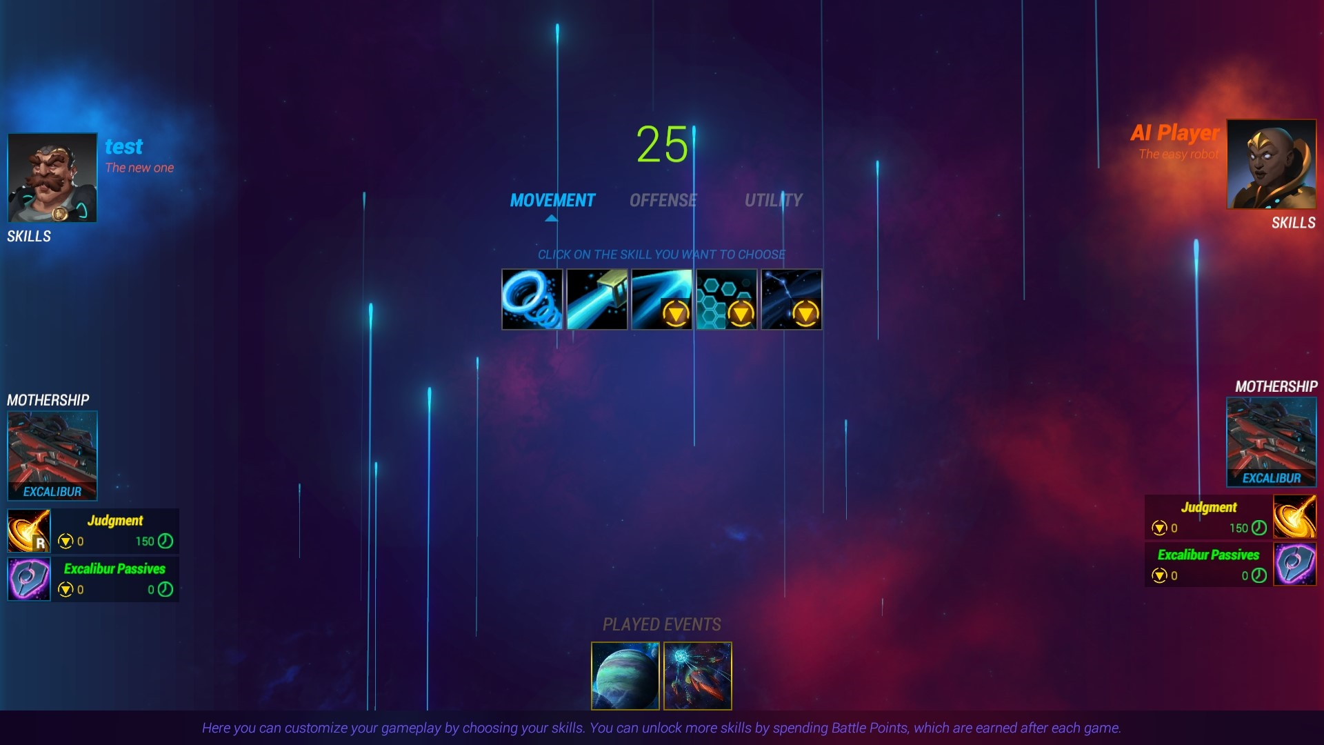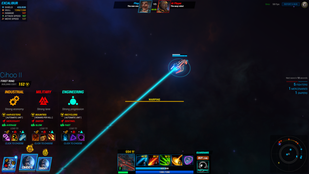 Si je laisse volontairement ce dernier élément de côté pour le moment, c’est pour mieux vous expliquer le sel de BTV. Comme vous le savez peut-être, un MOBA oppose deux équipes qui ont pour but de détruire le camp adverse en explosant un bastion à l’opposé du sien. La carte menant aux deux objectifs est parsemée d’embûches et regorge d’ennemis contrôlés par l’ordinateur. On retrouve tout cela dans Beyond the Void à la différence qu’il n’existe qu’un seul chemin entre vos planètes mères et actuellement les combats se limitent à du un contre un. Si cet aspect amène de la légèreté face aux ténors comme League of Legends ou DOTA 2, BTV n’a pas à être jaloux tant son gameplay s’avère riche en possibilités. Tout d’abord, la zone de combat est plutôt vaste car elle recouvre un système solaire avec diverses planètes à conquérir (elles apparaissent au fur et à mesure de la partie) pour y construire des choses capables de récolter des ressources et de créer de nouvelles unités qui attaqueront automatiquement la ligne adverse. Votre vaisseau peut aussi aller à la bagarre grâce à son propre équipement et ses différents pouvoirs comme des impulsions électromagnétiques ou des augmentations temporaires de la vitesse. On retrouve alors à faire des allers-retours entre la ligne d’attaque (la lane) et les astres pour se défendre face aux harcèlements ennemis, il faut être alors au taquet et bien gérer ses déplacements pour être très efficace – dans le jargon, on dit qu’il faut gérer sa micro, une suite de petites actions rapides en continue en somme.