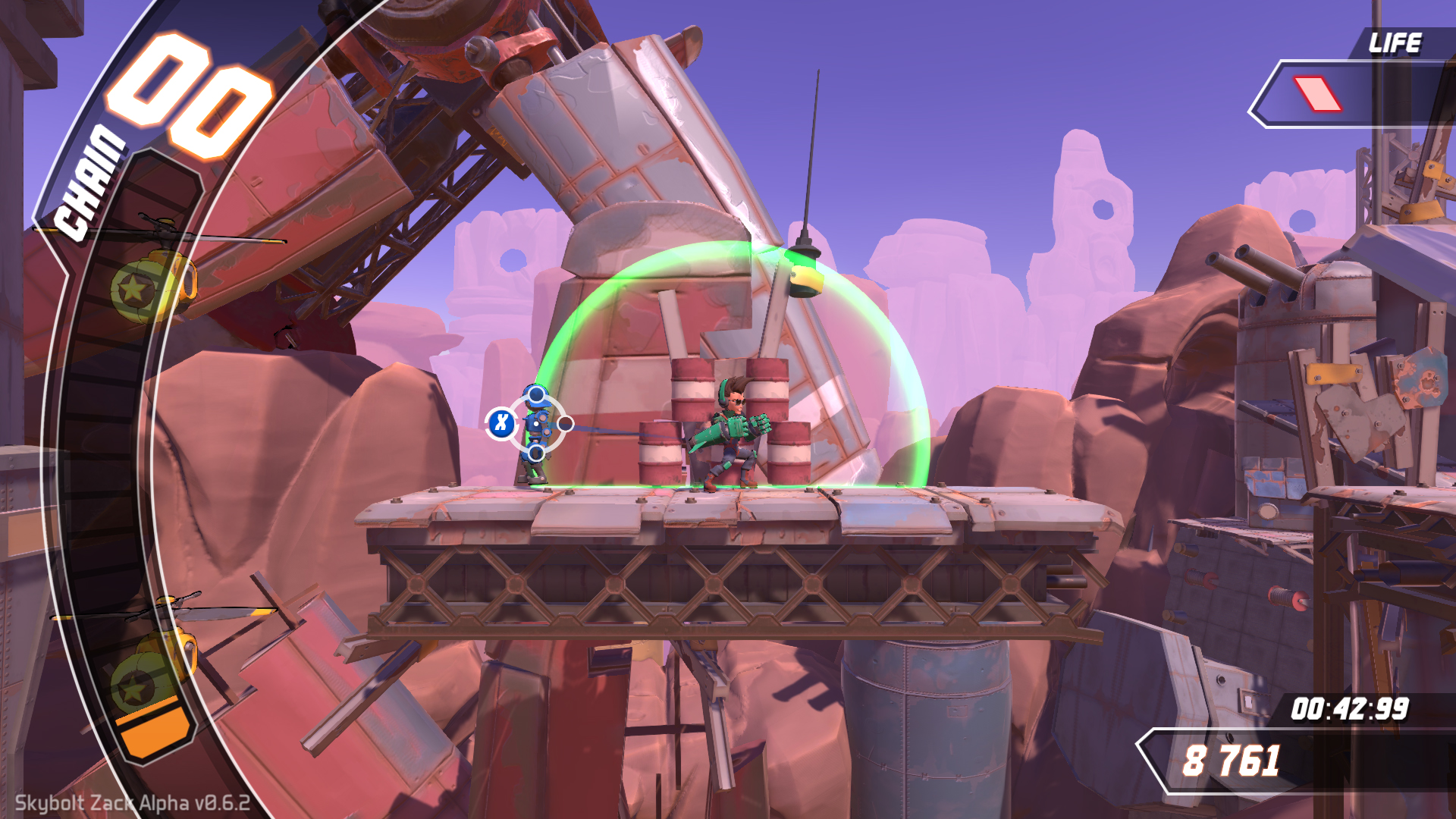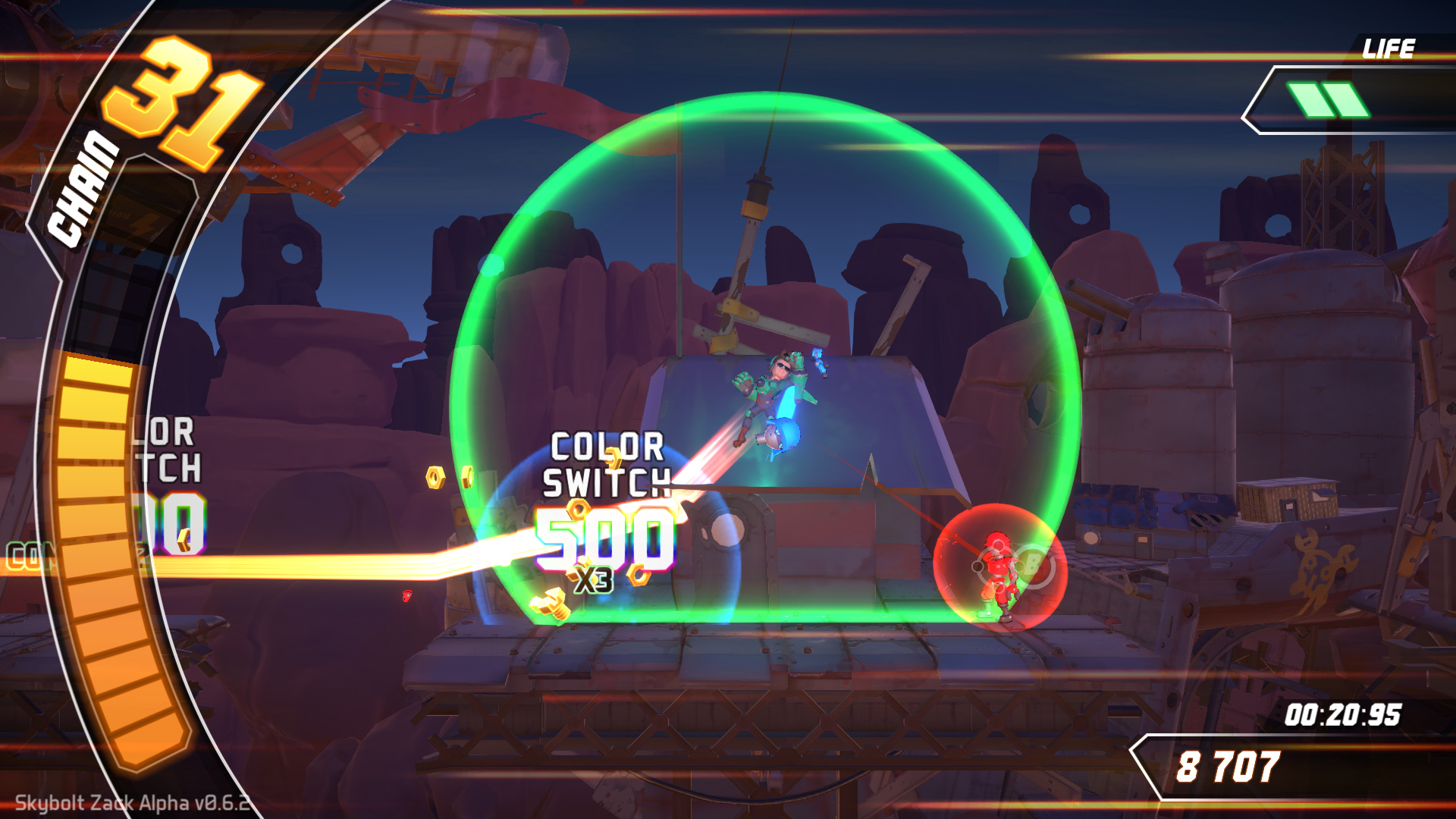 Petit et rapide rappel car notre dernier article est très récent, Skybolt Zack est un jeu vidéo mêlant plateforme et rythmique pour atteindre la fin des niveaux. Étant basé sur le scoring, vous pouvez très bien finir en marchant mais cela ne vous rapportera que peu de points, du coup il vous est possible de vous téléporter d’ennemi en ennemi en appuyant sur une bonne touche au bon moment. Le jeu est alors un Guitar Hero futé avec un level design de génie proposant plusieurs parcours en fonction de votre niveau. Plus vous monterez, plus ce sera dur mais meilleur sera votre score et donc votre skill.