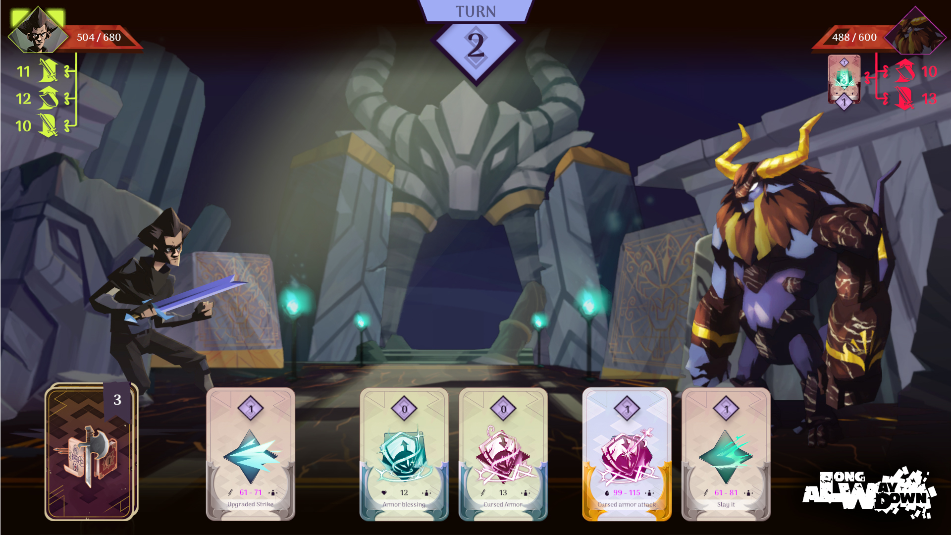 Chaque camp a un certain nombre de vies représentant le nombre de fois maximum de votre vaisseau peut se faire toucher par les balles ennemies. Le coéquipier à lui une énergie à gérer (elle augmente seule avec le temps) et à dépenser avec des vraies cartes tirées dans un tas devant lui. Chaque carte à un coup et permet d’activer des améliorations comme un tir plus rapide ou un bouclier de défense.