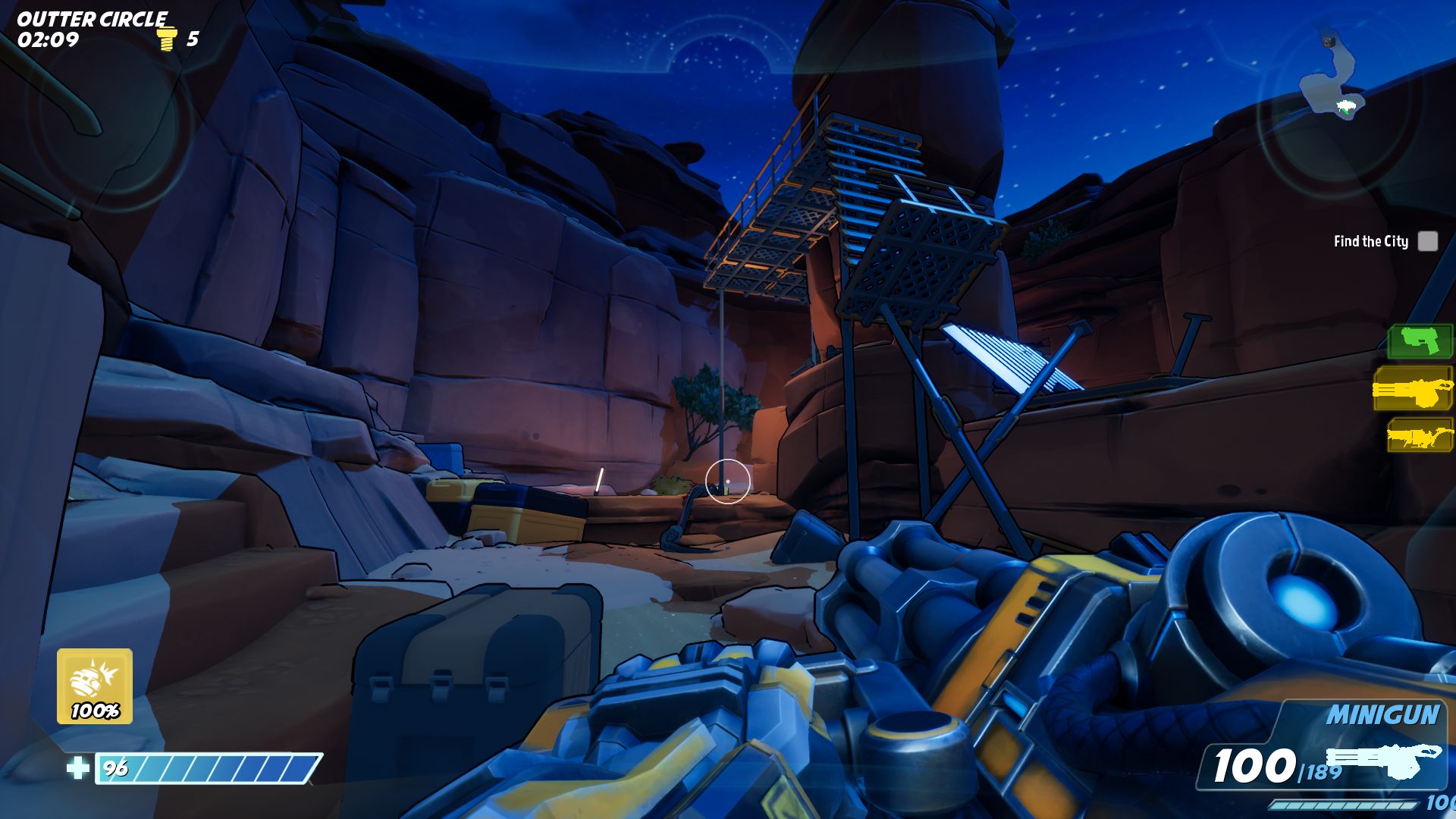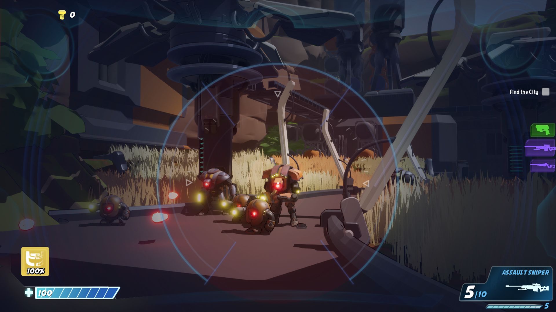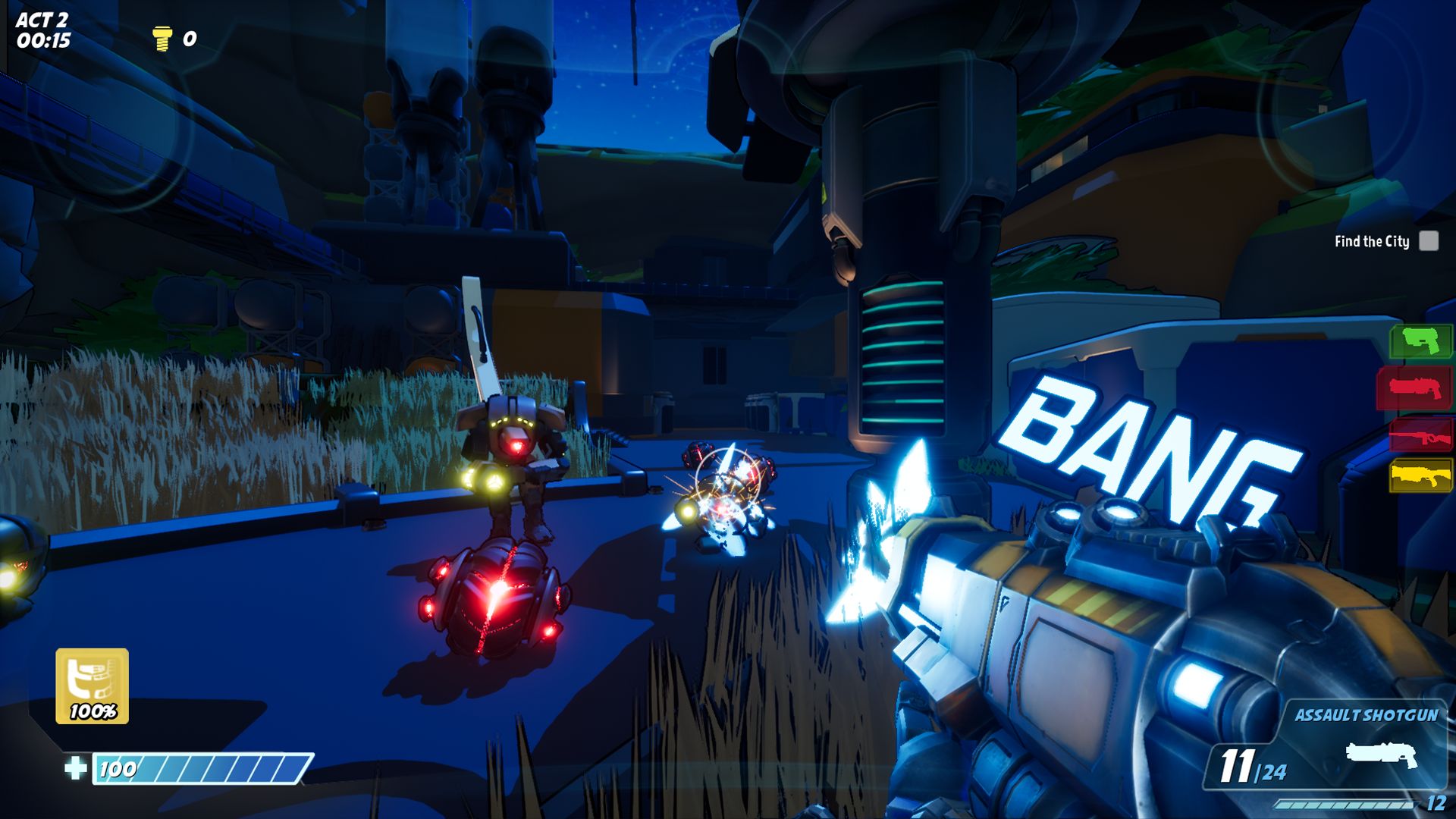 Les chefs d’œuvre cités précédemment ont sûrement été une grande source d’inspiration pour RyseUp Studios, car les sensations sont très bonnes. Je ne suis pas un très bon joueur de FPS au clavier et à la souris – je sais, je n’ai plus aucune crédibilité quand je dis que je me débrouille mieux à la manette, punissez-moi, je suis très vilain ! – mais je me suis grandement éclaté durant une petite vingtaine de minutes. Le robot est très agile et les commandes répondent à merveille. Le premier environnement visité faisait penser aux canyons de Borderlands – sentiment prononcé par le côté cartoon des graphismes en cell shading – avec de longs et larges couloirs avec plusieurs branches. On saute partout, on court, on tire sans s’arrêter, le flot de violence est extrême.