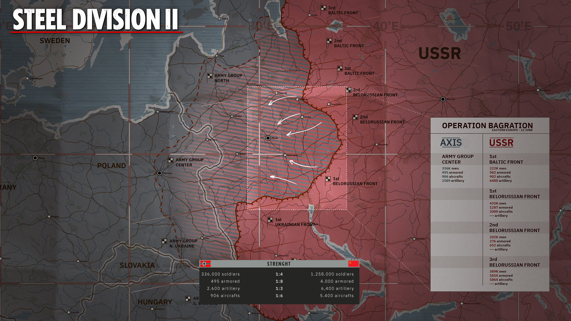 Comme d’habitude, Eugen s’est entouré d’historiens pour créer Steel Division 2. Si tout le monde est censé connaître l’Opération Overlord qui s’est déroulée en Normandie à partir de juin 1944, peu connaissent son cousin qui a débuté en Biélorussie moins de 20 jours plus tard. De grandes batailles avaient déjà eu lieu entre les garnisons nazies et russes (on pense de suite à Stalingrad) mais après la percée alliée en France, les Russes débutèrent aussi une avancée spectaculaire face aux troupes de l’Axe.