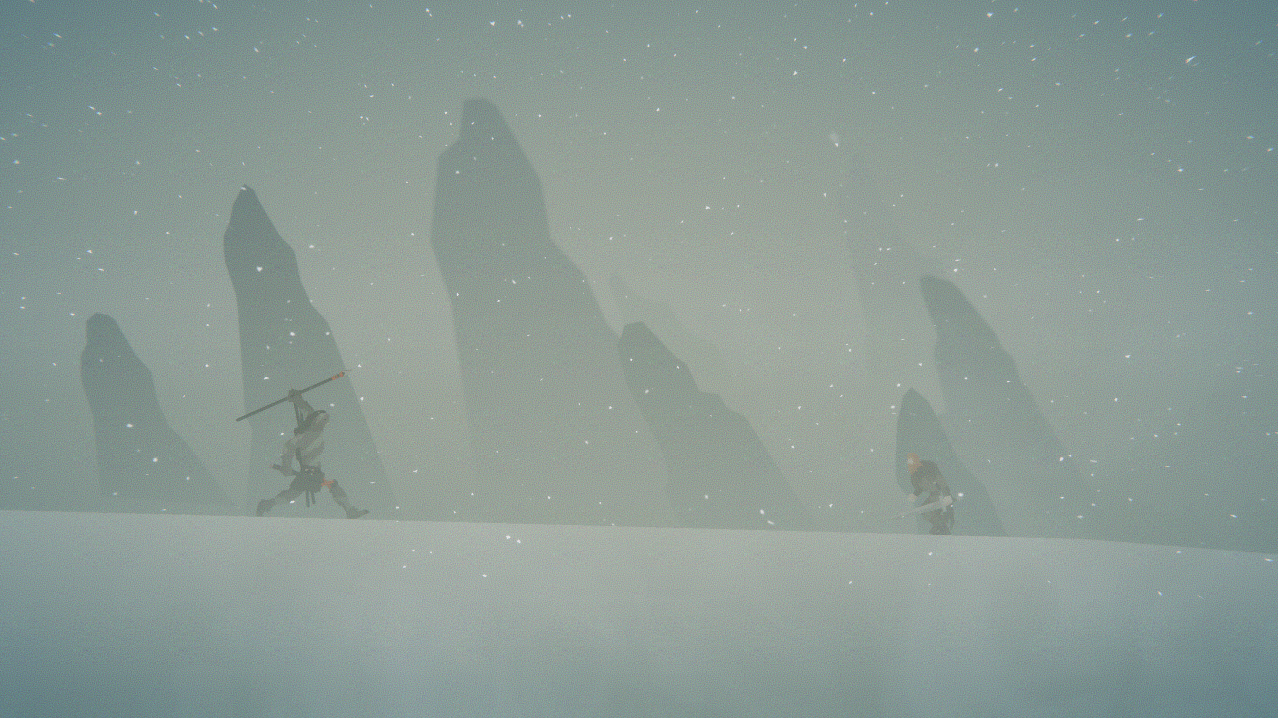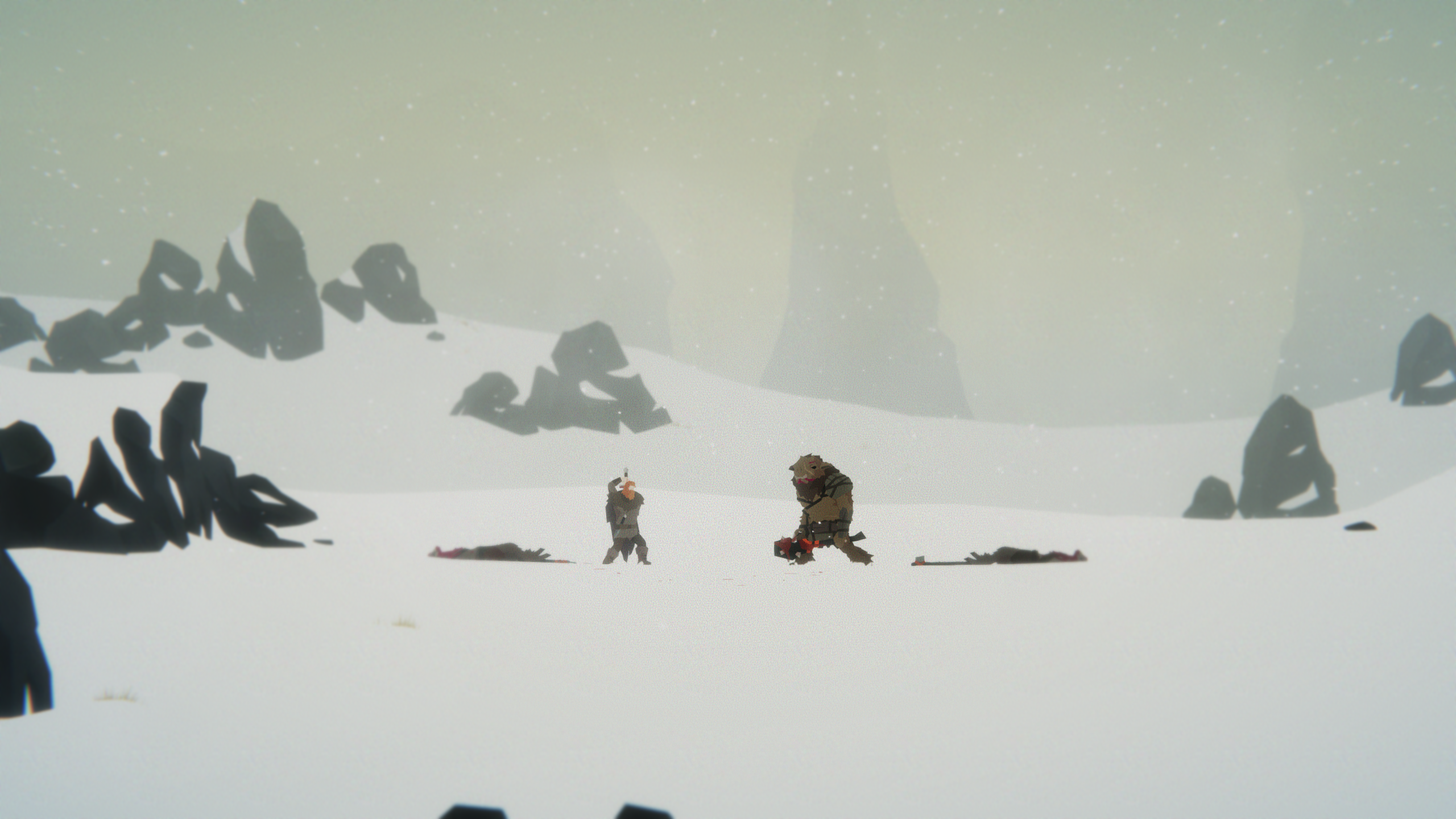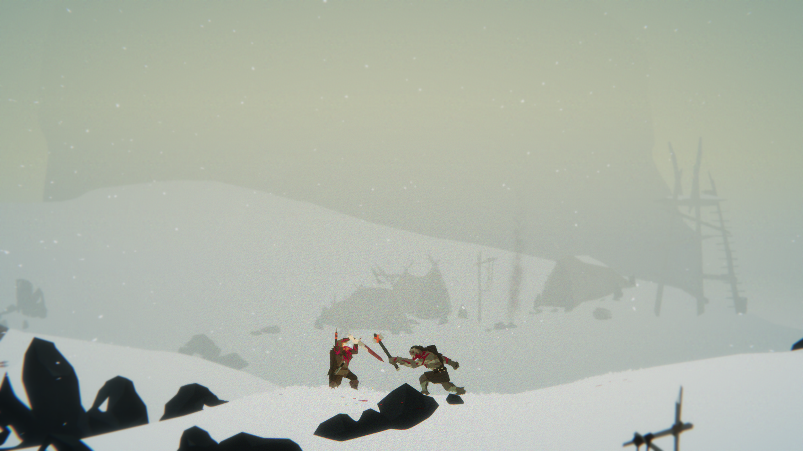 L’entraînement terminé face à sa femme (dans le jeu hein), notre gaillard du nord s’en va à la recherche de sa famille. Tel un retour en arrière, le défilement se fait étrangement vers la gauche, comme si on voulait revenir à un état précédant. C’est perturbant mais tout à fait logique du point de vue narratif. L’histoire sera racontée de façon implicite, comme Limbo ou Inside justement. Il n’y aucun élément graphique à l’écran, juste les personnages et le décor. Tout est suggéré à l’aide de la narration environnementale.