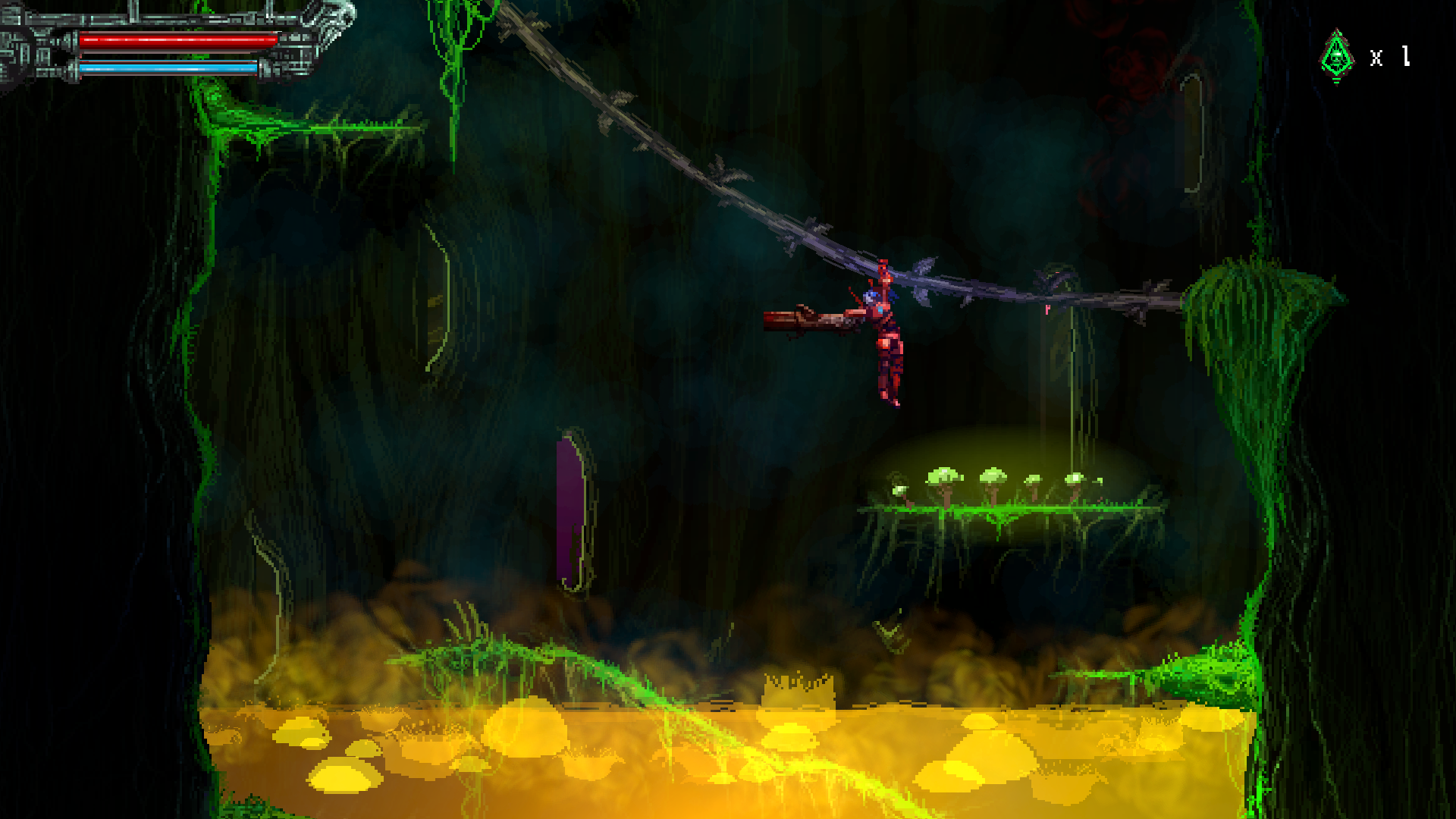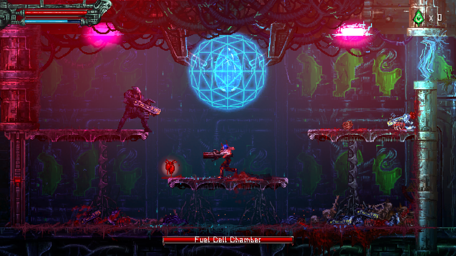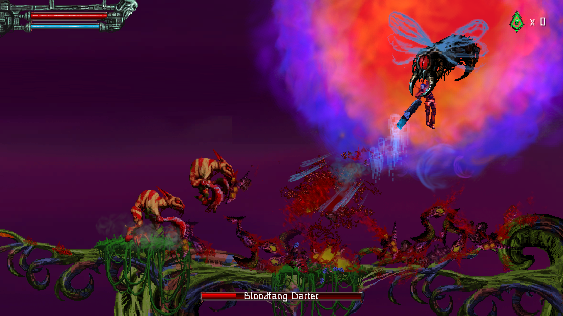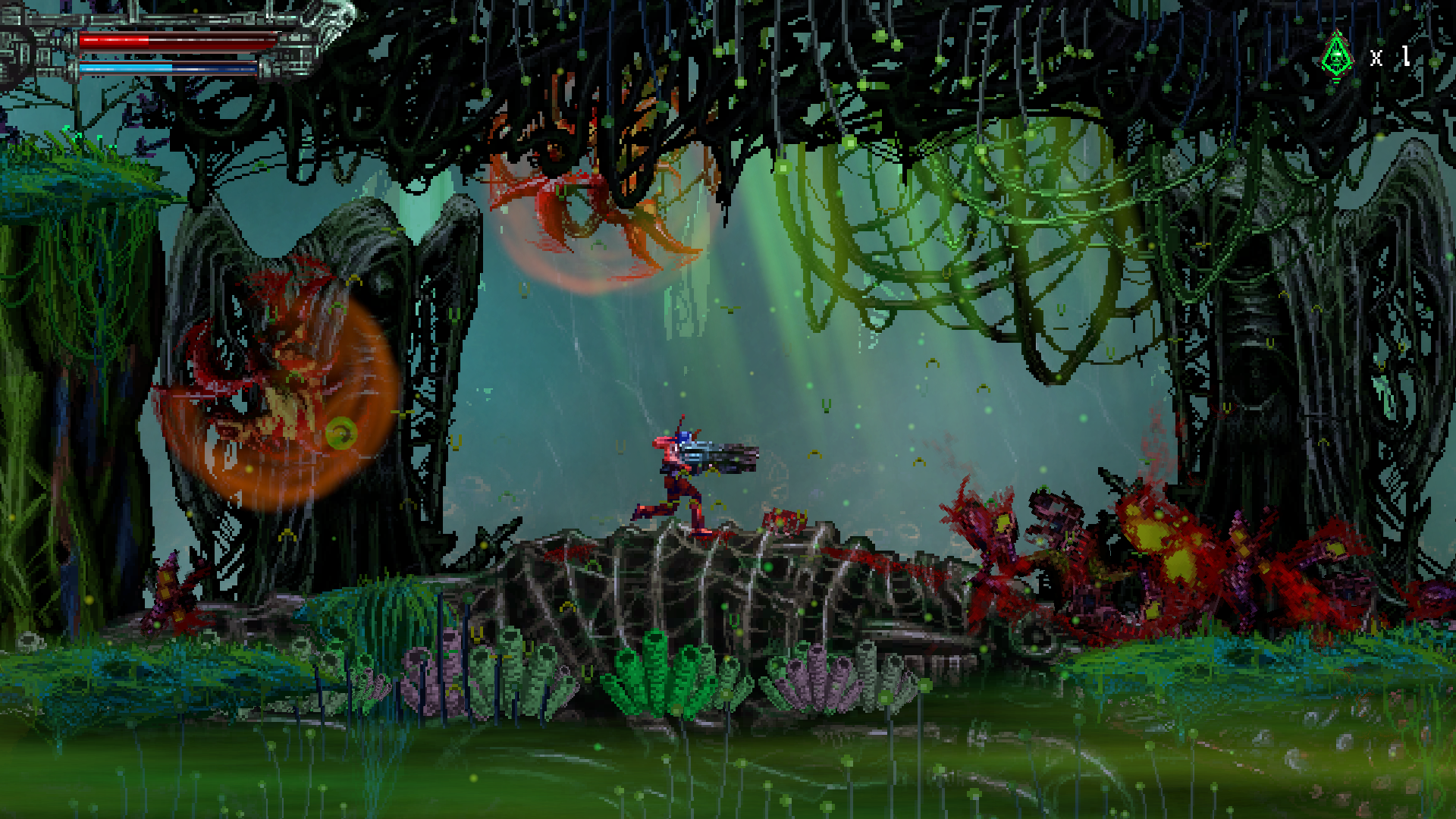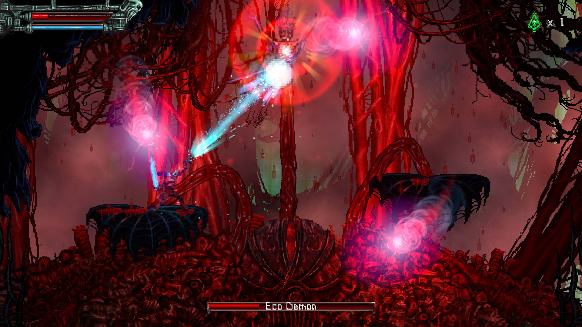 Ma psy m’a dit qu’il fallait lâcher prise, c’est pourquoi je vous en parle aujourd’hui. Ça permet de se débarrasser de ses démons. Mais revenons à nos moutons, voulez-vous. Valfaris est une suite légitime à Slain. C’est l’enfant héritier d’un gameplay à l’ancienne avec de gros pixels qui tachent et du gros métal qui font vibrer mes cordes musicales. On retrouve un jeu à défilement horizontal, en 2D donc, mais avec beaucoup de verticalité tout de même. Le jeu fait la part belle à l’action avec des tonnes d’ennemis à trucider à l’aide de la grosse trentaine d’armes à votre disposition. Mention spéciale au canon-laser-lasso du plus bel effet.