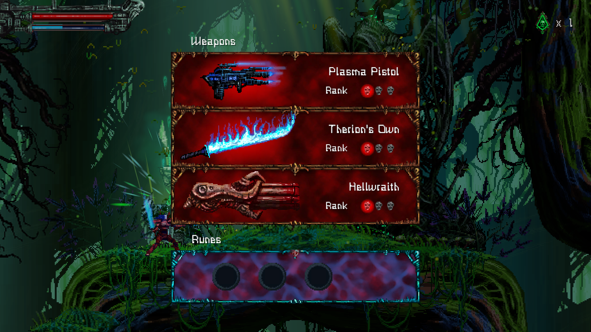 La difficulté sera au rendez-vous avec des ennemis nombreux et des patterns de tirs coriaces. Les développeurs ajoutent un autre degré de challenge, car vous serez en charge de sauvegarder votre progression (le jeu peut sembler avoir une gueule de Rogue-lite mais ce n’en est pas un.) Des cristaux sont à récupérer dans tous les niveaux et vous pouvez décider de les utiliser, soit pour enregistrer votre avancée sur l’un des points prévus à cet effet, soit pour améliorer votre équipement. Trois emplacements par arme sont prévus, et pour avoir vu les flingues et les épées au niveau maximum, c’est ultra dévastateur et kiffant. Il faut alors se forcer à parcourir toute la carte, rechercher les salles secrètes, pour se mettre bien pour la suite.