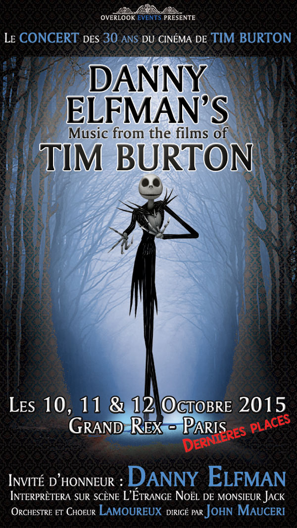 À l’occasion du trentième anniversaire de la carrière de Tim Burton, Danny Elfman se produira sur scène en conduisant l’Orchestre et le Chœur Lamoureux comprenant pas moins de 90 musiciens et 45 choristes, mais aussi en interprétant personnellement les chansons de Jack Skellington dans L’Étrange Noel de monsieur Jack. Au programme, des musiques issues de Batman, Beetlejuice, Edward aux mains d’argent, Charlie et la chocolaterie, Les Noces funèbres, Alice aux pays des merveilles. Ça se passe au Grand Rex, à Paris, et il ne reste plus que des places de disponibles pour le lundi 12 octobre. Si vous souhaitez réserver dès maintenant, ça se passe là.
