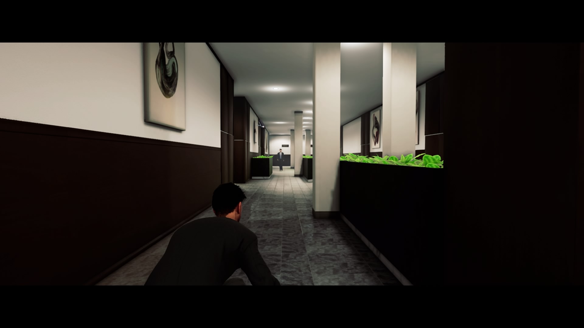 Bien vite, on se rend compte que le jeu de Phantom8 s’enferme dans une répétitivité nauséeuse à cause de mécaniques de Gameplay peu approfondies ; sentiment renforcé par un level design raté qui ne se renouvelle jamais ou presque. Un schéma s’installe alors : on entre dans une pièce, on se cache derrière un mur, on désactive une caméra s’il y en a une, et on tente de se faufiler discrètement. Et je précise bien « on tente », car, bien souvent, la manière forte prend le dessus sur l’élégance de la discrétion. Effectivement, à part péter des caméras, ralentir le temps et s’accroupir, Ian ne sait rien faire. Il n’a, semble-t-il, jamais appris à déplacer les cadavres pour les planquer (les méfaits de l’arthrose ?) et ne peut pas envoyer un leurre pour divertir les (nombreux) méchants. Alors on finit par sortir ses gros flingues, en se résignant à foncer dans le tas.