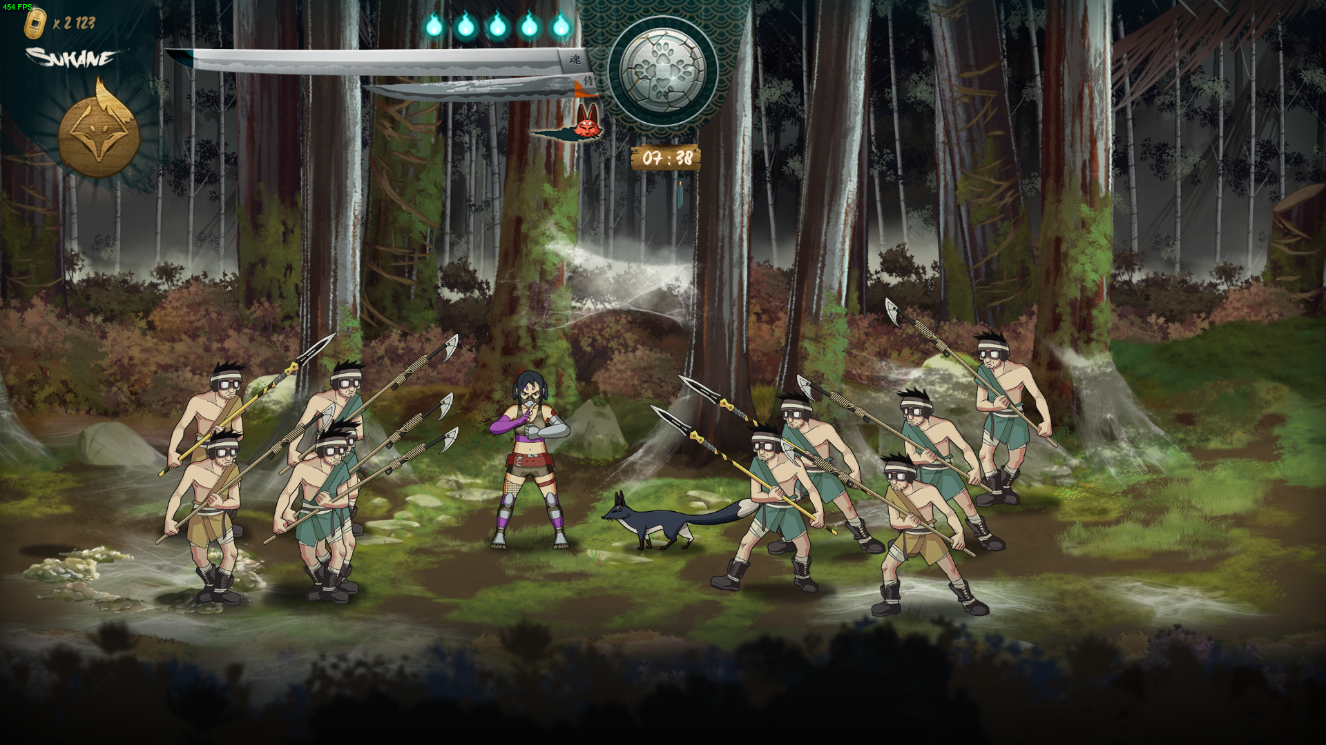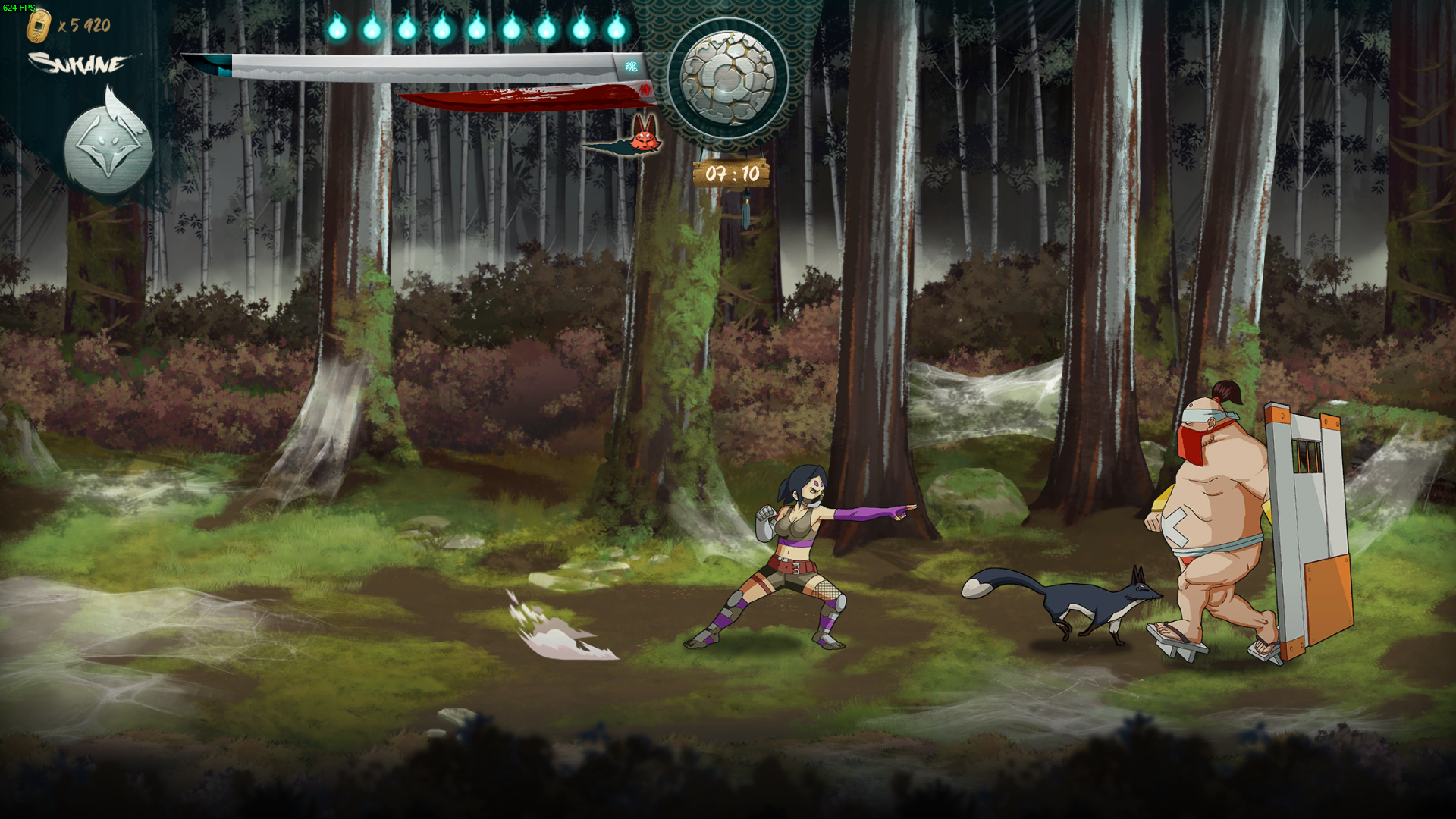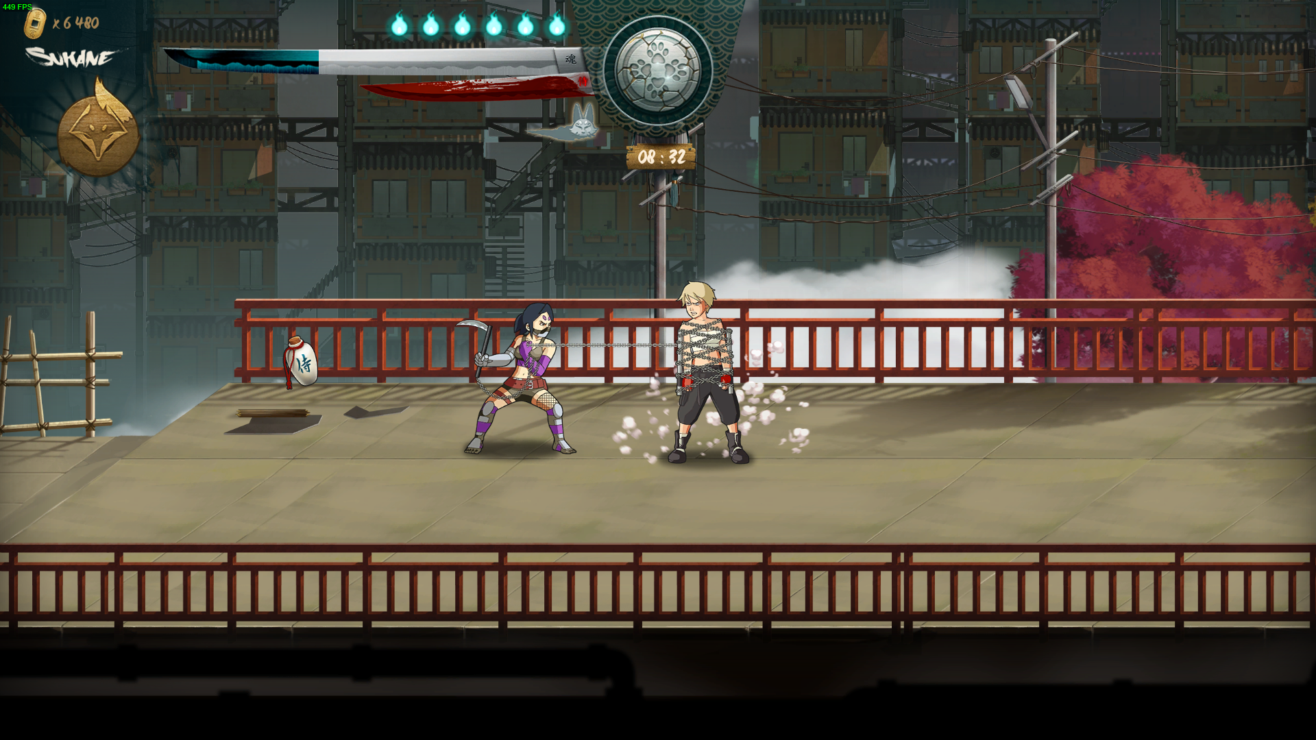 Au niveau des combats on remarque de nombreuses similitudes avec ses modèles où on a toujours un peu de mal à savoir sur quel plan de profondeur sont les ennemis mais une fois fixé, les patates se multiplient à grande vitesse. Les deux personnages, Sukane et Tsurumaru, possèdent des coups totalement différents et donc un gameplay légèrement distinct. Sukane, la Kunoichi (femme ninja), axe plus son gameplay sur l’agilité et la rapidité avec des coups au corps à corps dévastateurs et des roulades pour s’échapper. Elle est aussi aidé de son ami renard, Azu, qu’elle peut envoyer ligoter un ennemi et même le ramener vers soi tel Scorpion dans Mortal Kombat. Tsurumaru, quand à lui ressemble plus à Jin de Samurai Champloo, un samouraï droit dans ses bottes, armé d’un sabre (katana ?) et usant d’un art de combat plutôt classique, à l’exception de grenages qu’il peut lancer, ou d’une chope pour fracasser des côtes dans la bonne humeur sans que l’ennemi ne puisse bouger. Dans les deux cas, vous pouvez facilement enclencher des combos grâce à seulement deux touches de coups – système classique avec coup un faible et un fort à enchaîner du genre « XXXY » – pour ensuite sauter pour lancer un coup de pied pour enfin utiliser un coup ultime dans la mêlée.