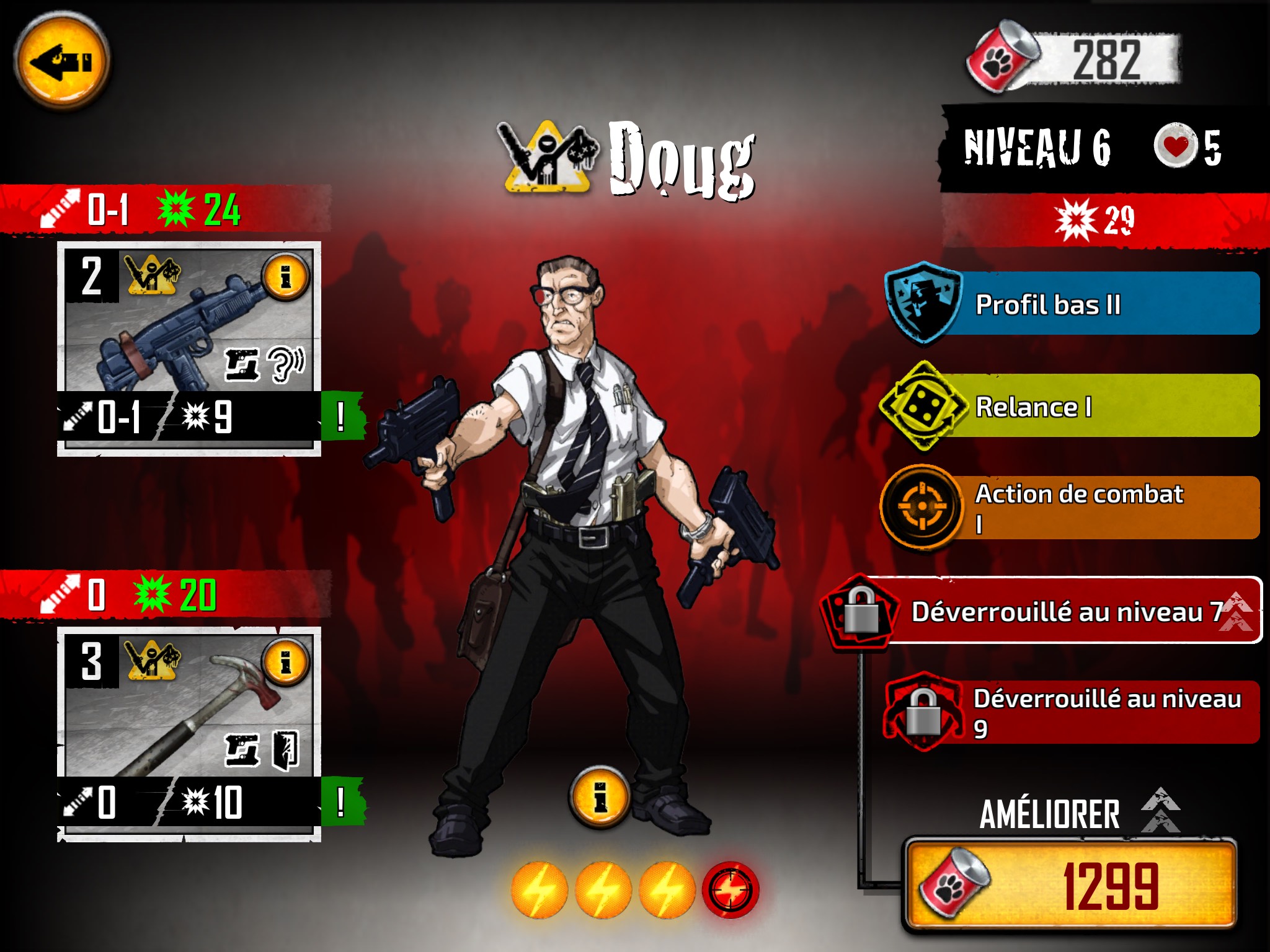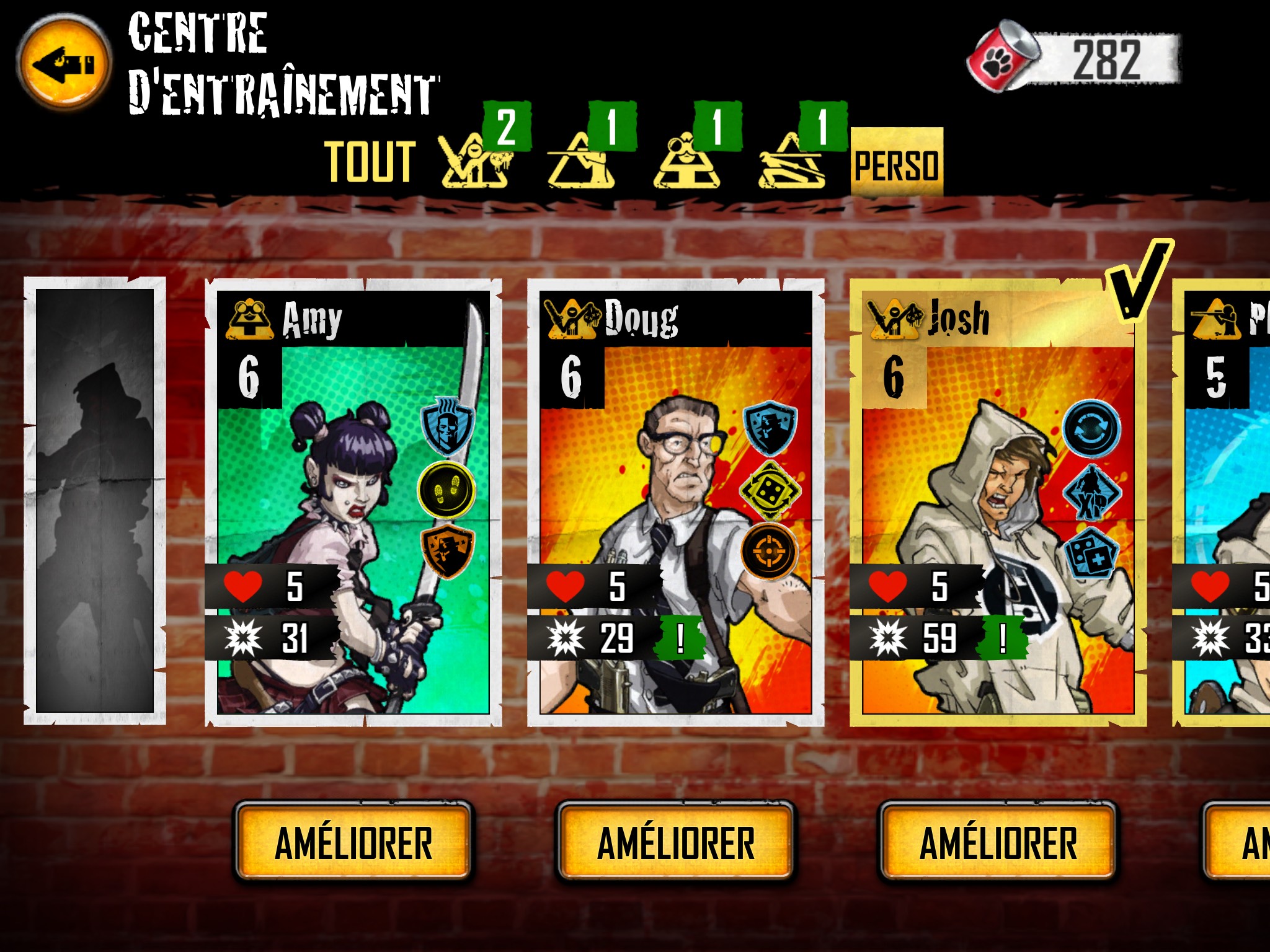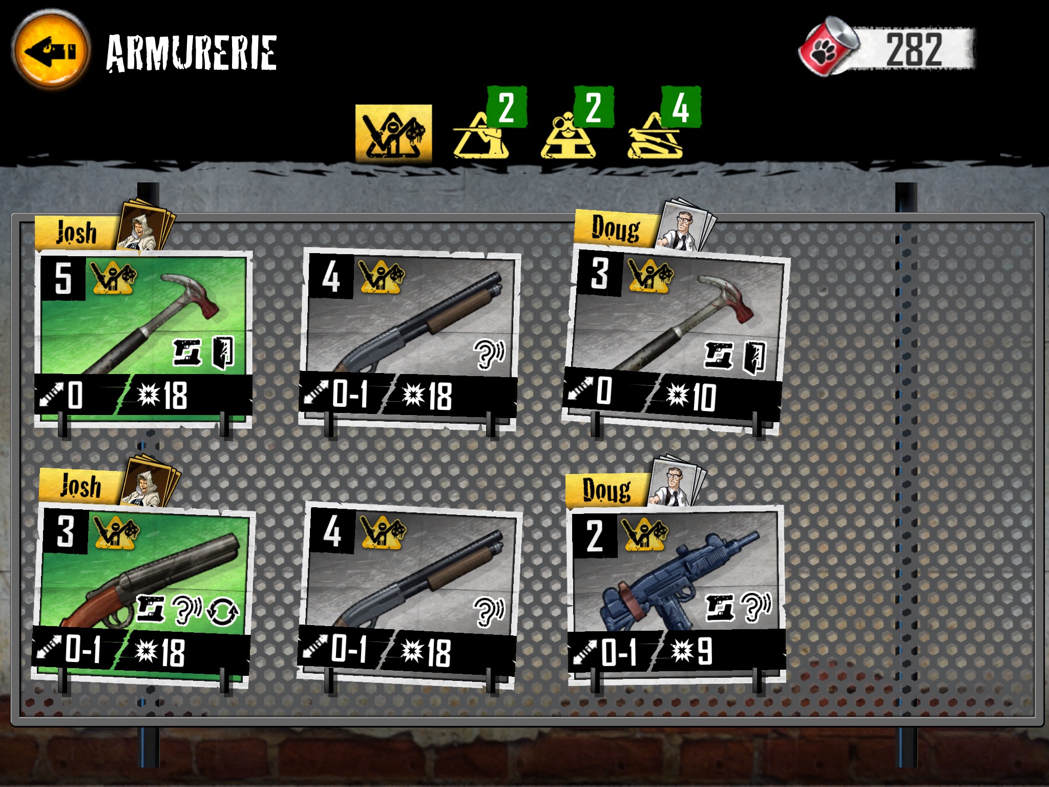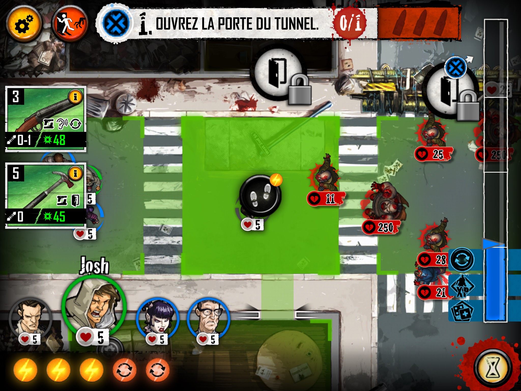 Mais il y a plusieurs éléments qui changent, tout d’abord les tours de jeux, ici chaque personnage ne fait pas son tour complet avant de passer au suivant. Vous pouvez tirer avec un personnage, puis vous déplacer avec un autre, puis revenir au précédent… ce qui est une très bonne idée. Ensuite les Zombies ont des points de vie, ce qui amène à l’autre nouveauté, l’amélioration des armes et des personnages.