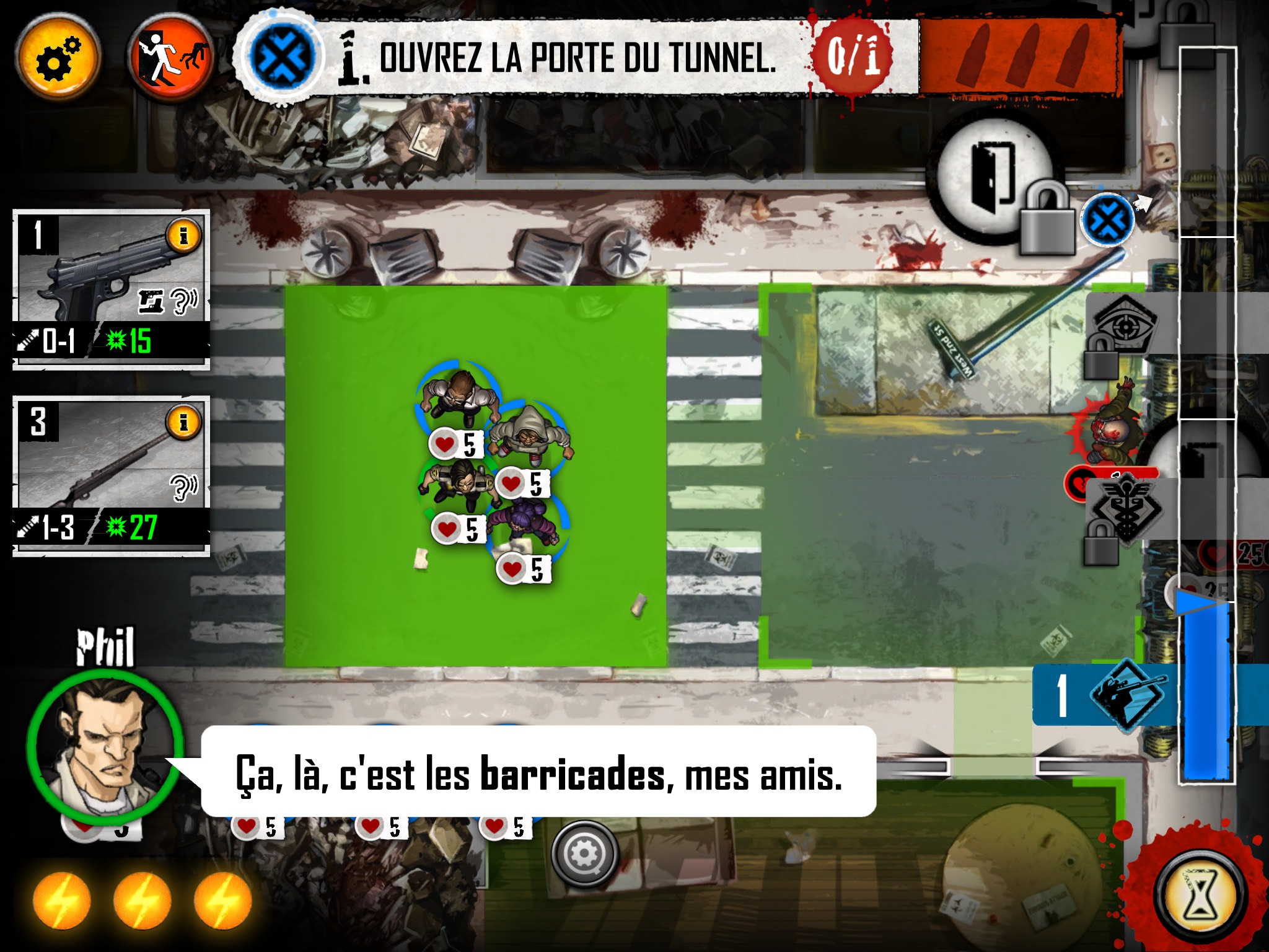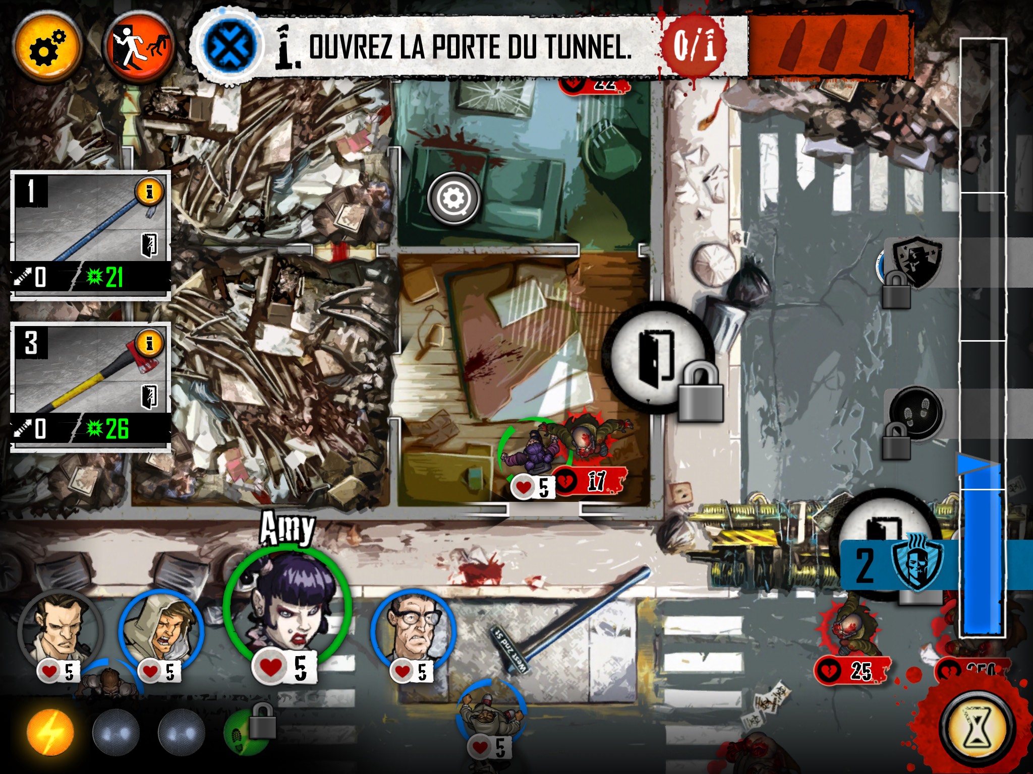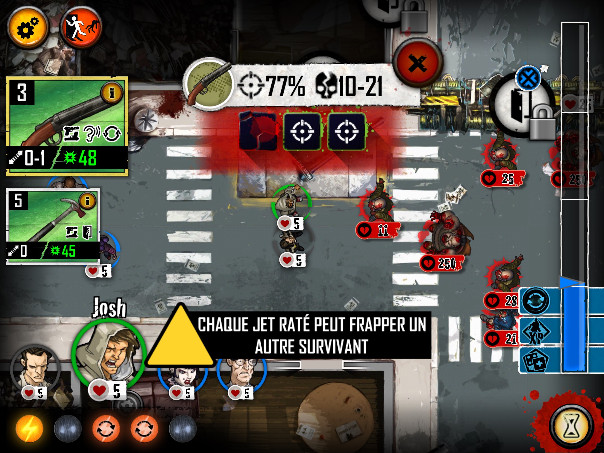 L’appli reprend quasiment en tout point le jeu de base Zombicide, mêmes illustrations, mêmes personnages, vu du dessus. A chaque tour vous avez 3 actions à faire, vous pouvez donc vous déplacer, fouiller, ouvrir des portes et bien sur tuer des Zombies. Tout en suivant un objectifs bien précis. Tout se fait avec des jets de dés, il suffit juste de glisser son doigt pour lancer les dés. Donc oui il y a de l’aléatoire, tout comme dans le jeu de plateau.