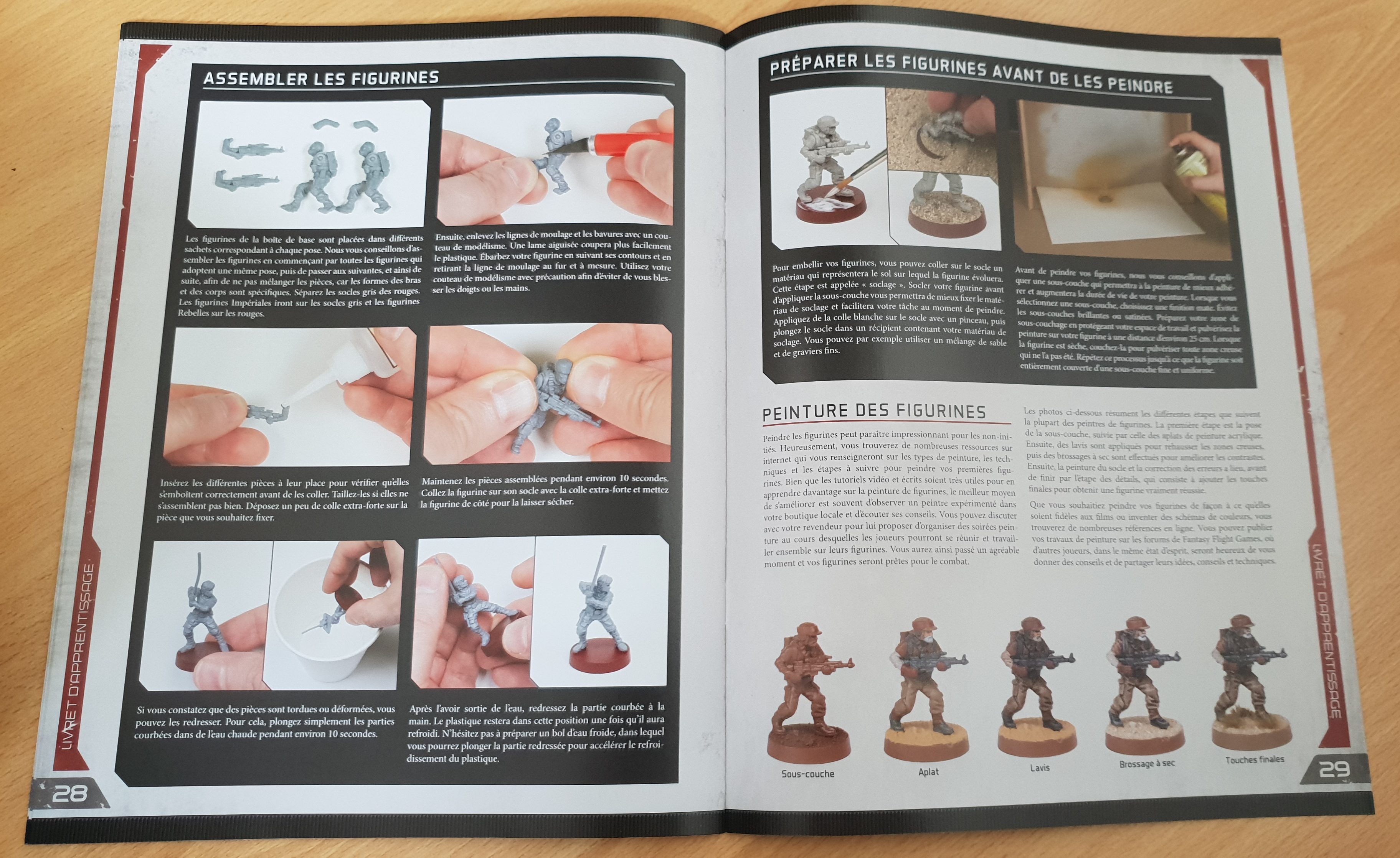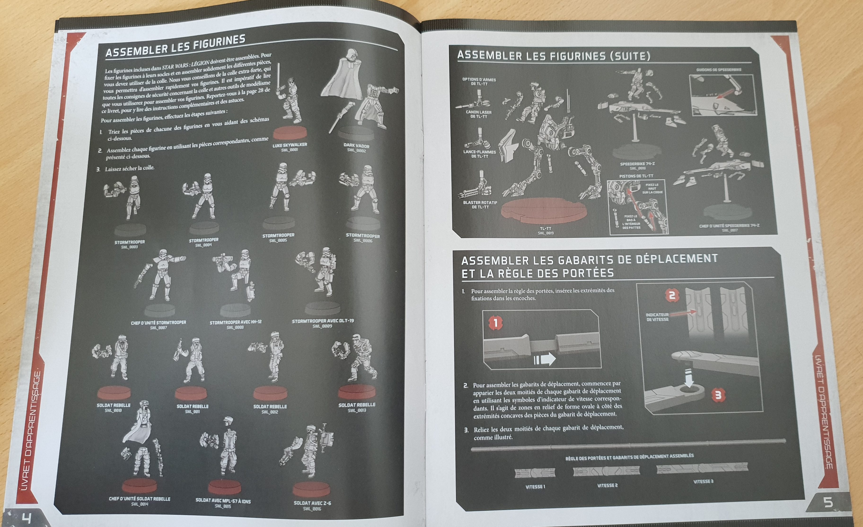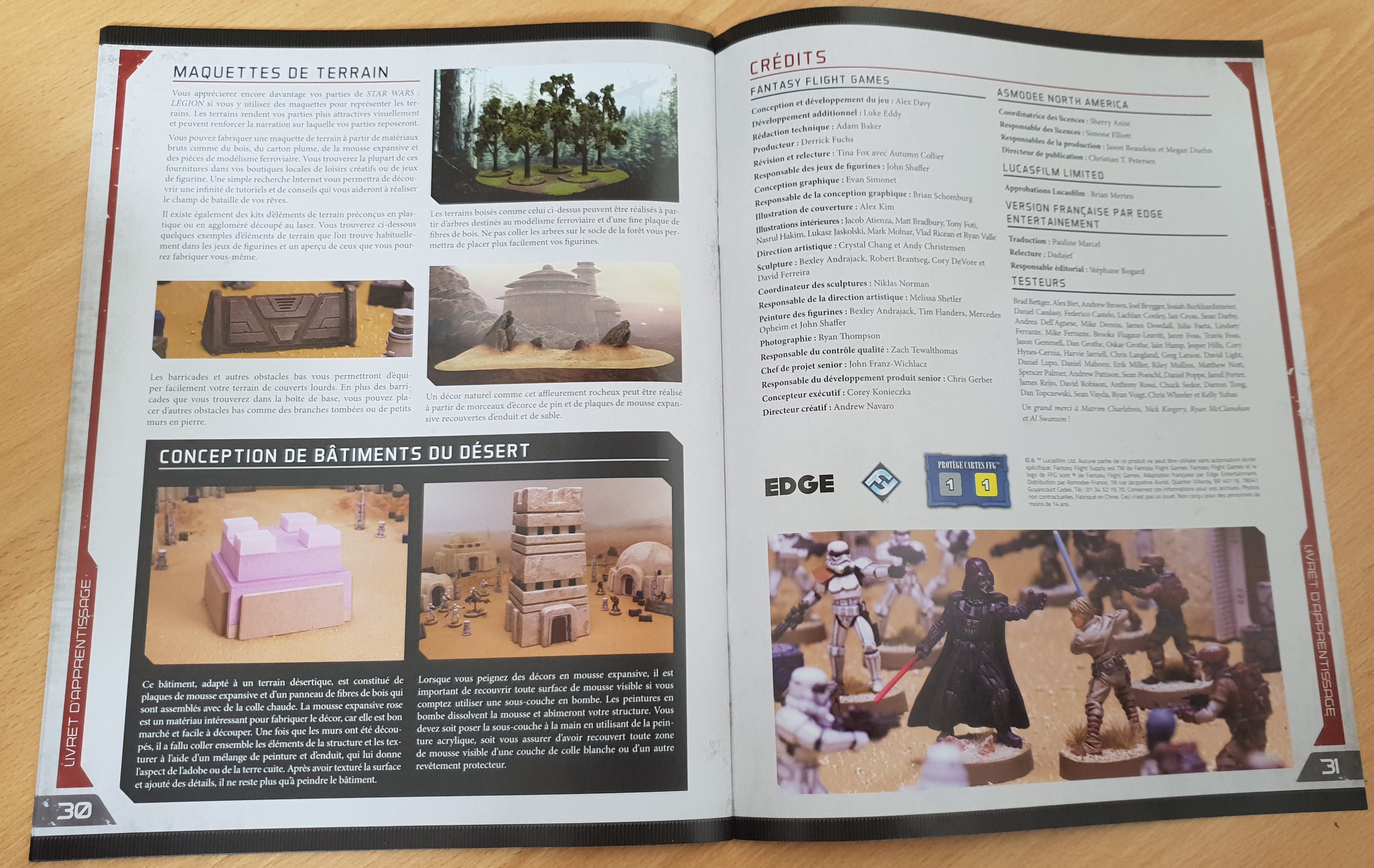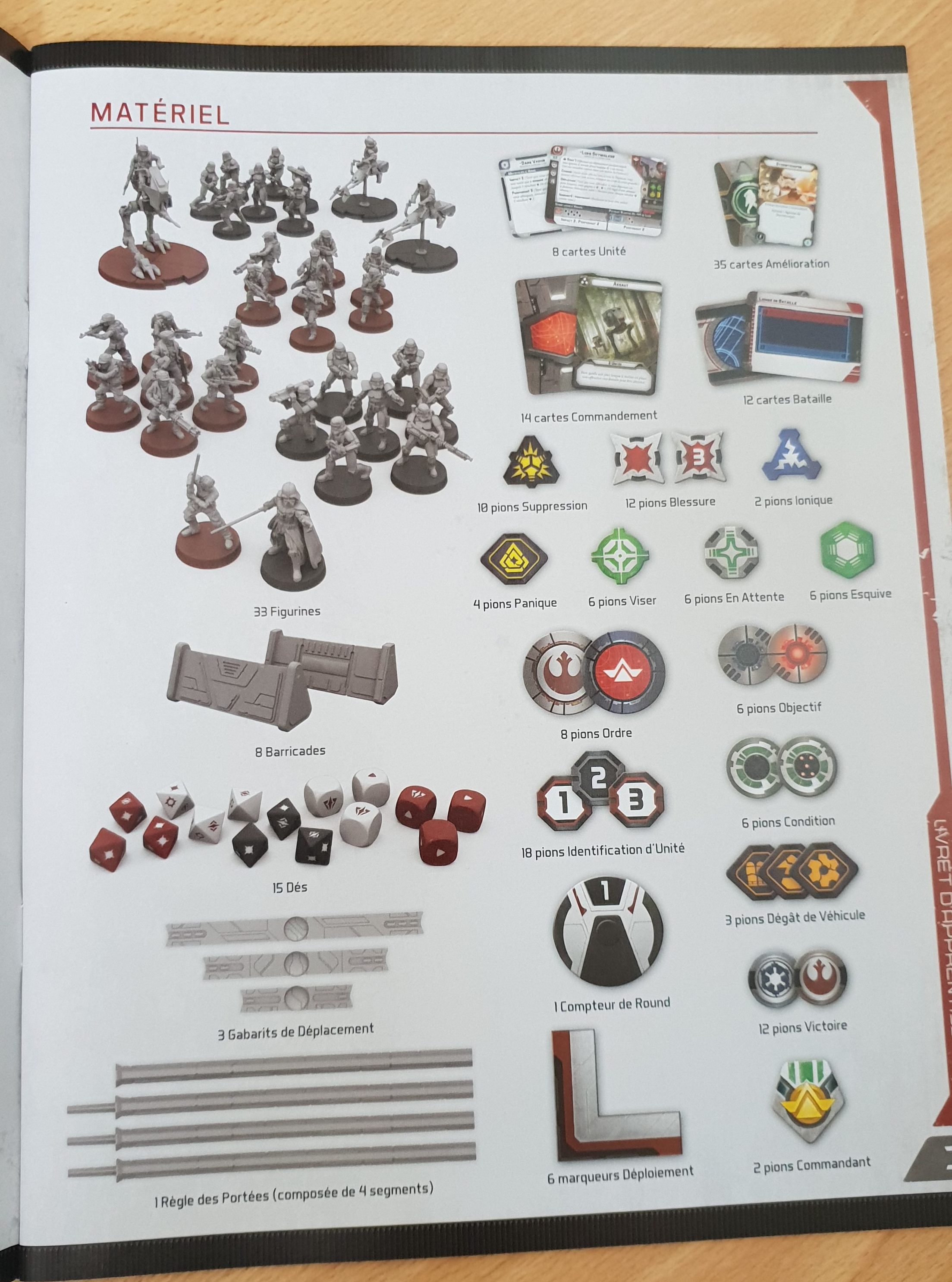 Outre ce matériel abondant, on trouve aussi un livret de 32 pages regroupant les règles (au travers d’une partie simplifiée qui fera l’objet d’un article à venir), des règles avancées ainsi qu’une partie consacrée à l’assemblage et à la peinture des figurines. Car c’est bien ce vers quoi Fantasy Flight Games semble vouloir se diriger : faire de Star Wars Legion l’étendard estampillé « hobby » du monde Star Wars. A vrai dire la démarche n’est pas complètement idiote, quand on sait le marché que peut représenter le hobby de Games Workshop, quand on connaît la force et la présence de Star Wars dans l’imaginaire populaire, il serait idiot de se priver d’un tel marché et de nous priver de l’opportunité de jouer aux petits stratèges sur table avec Dark Vador et consorts. C’est donc chose faite avec ce Star Wars Legion.