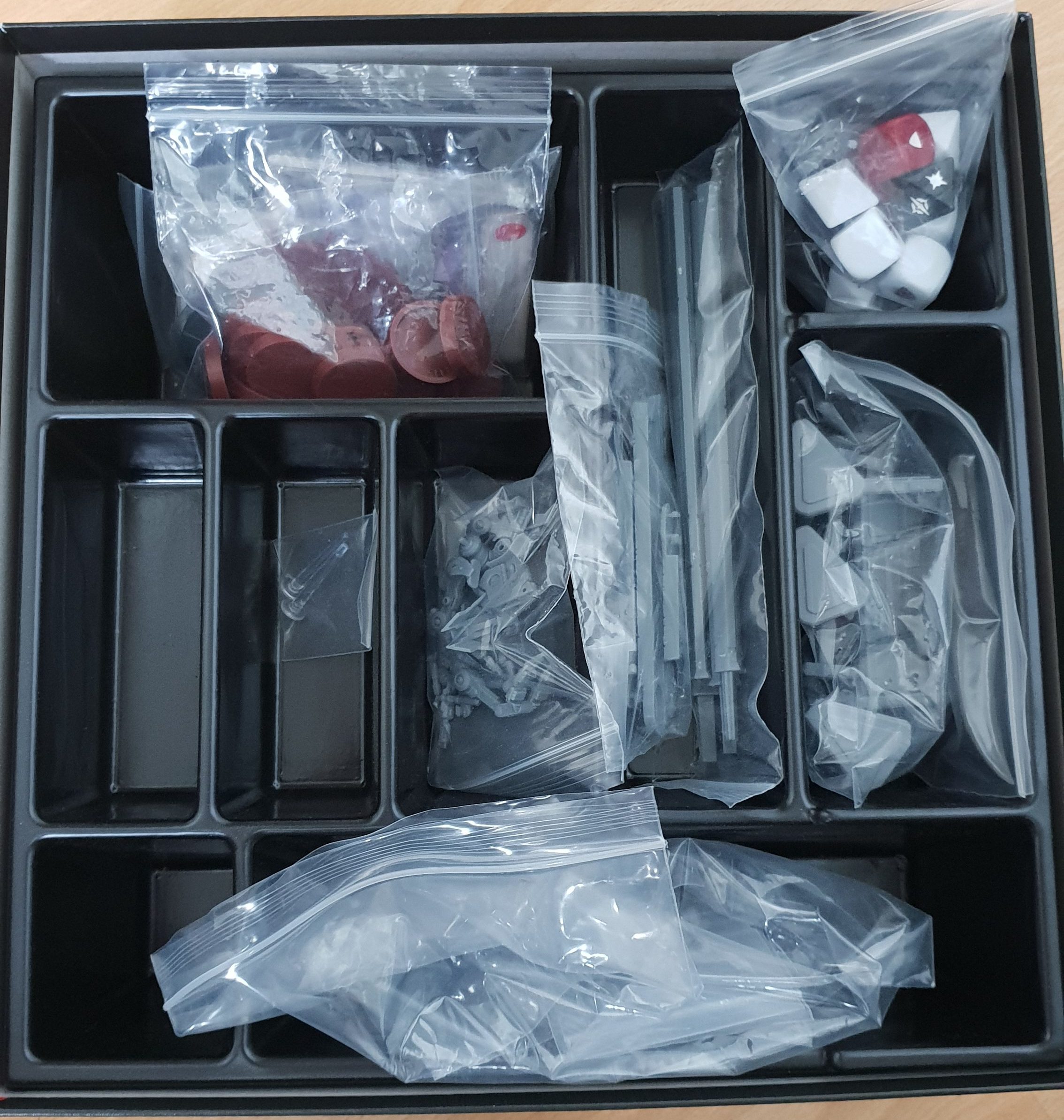 A l’ouverture on est saisi par la qualité de l’ensemble, une jolie boite thermo-formée pour tout ranger, des tas de sachets à zip pour séparer les différentes figurines (pas de grappes à découper et de pièces à ébarber ici, c’est du « hobby » pré-mâché).